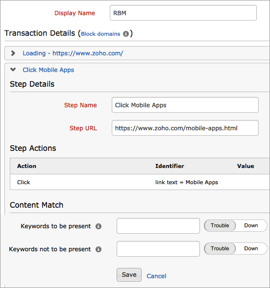 - Generate alert if the following keyword is NOT present: Select a particular step and enter the keywords which needs to be present in that action selected. Get alerted if the keyword is NOT present in that web page.