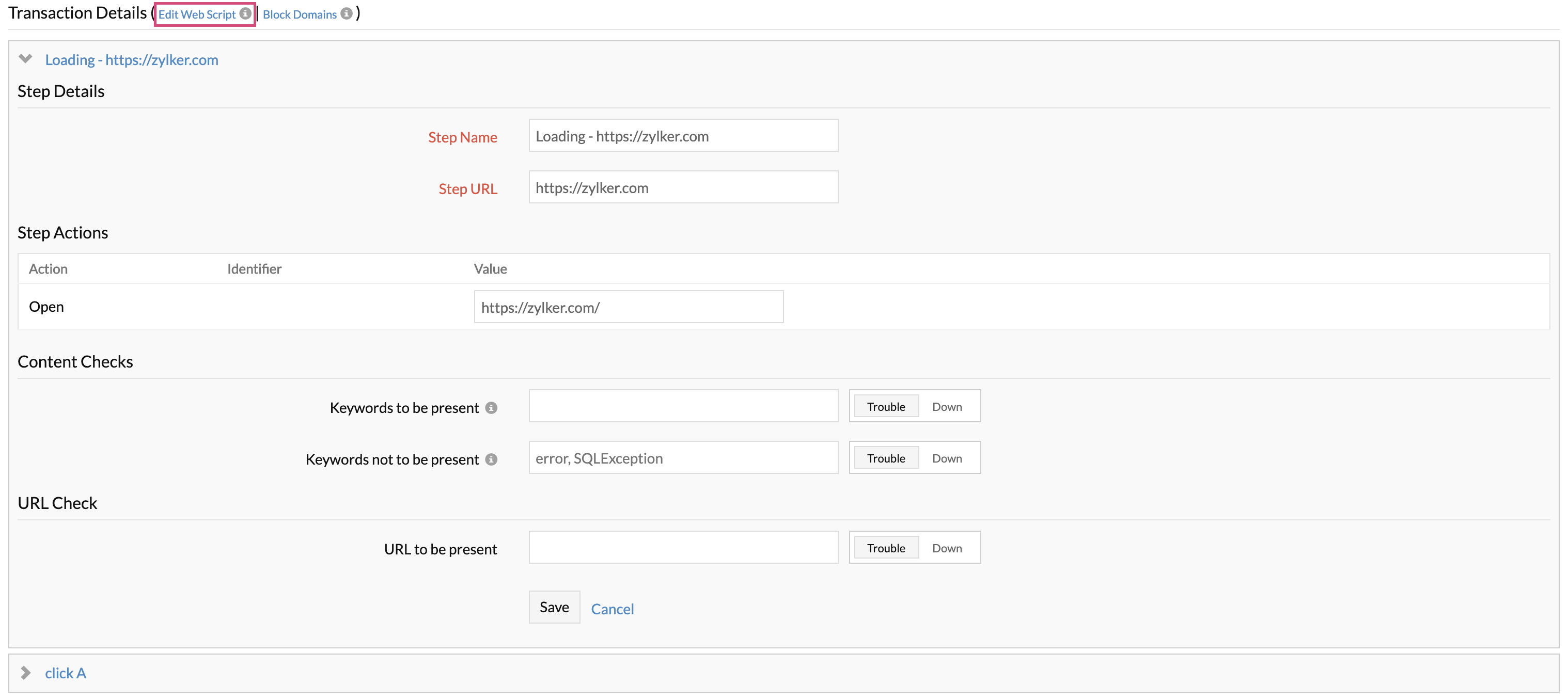 - If you have chosen to modify the step details of the Web Transaction (Browser) monitor, click the Edit Web Script link and update the script in the Web Script Editor.