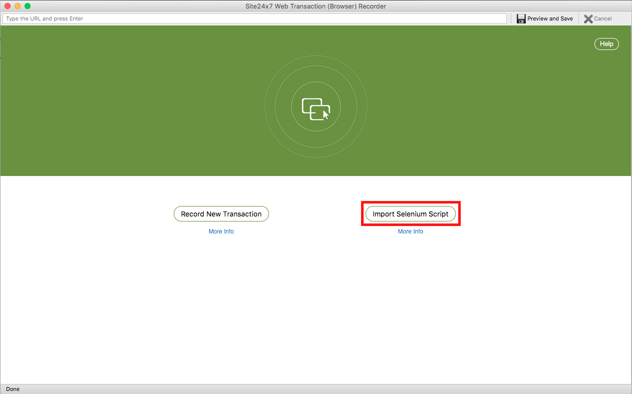 The Selenium-IDE (Integrated Development Environment) is a tool used to create Selenium based test cases/transactions. Its simple Firefox plug-in is an efficient way to develop test cases in .side format. You can import previously recorded .side/HTML test cases from the Selenium IDE into the Web Transaction (Browser) recorder. Once imported, you can set up Web Transaction (Browser) - Selenium WebDriver monitors automatically instead of recording them all over again. Follow the steps below to import a Selenium test case into Web Transaction (Browser) - Selenium WebDriver: