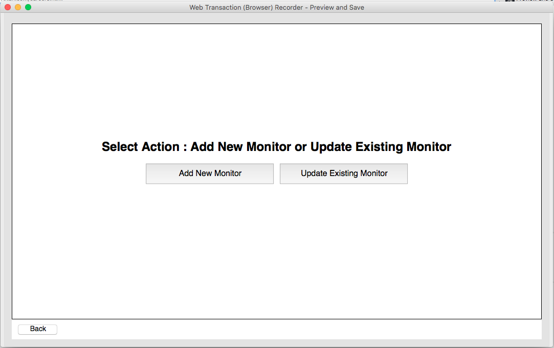 NoteYou'll be able to view the below window with the Update Existing Monitor button, only when there is a pre-existing Web Transaction (Browser) - Selenium WebDriver configured in your Site24x7 account. If you don't have any Web Transaction (Browser) - Selenium WebDriver setup in your account, you'll be directly asked to "Add New Monitor".