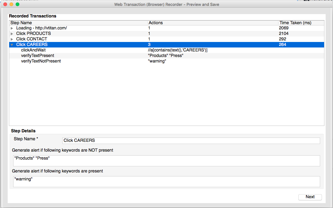 - Generate alert if the following keyword is present: Select a particular step and enter the keywords which need not be present in that action selected. Get alerted if the keyword is present in that web page.