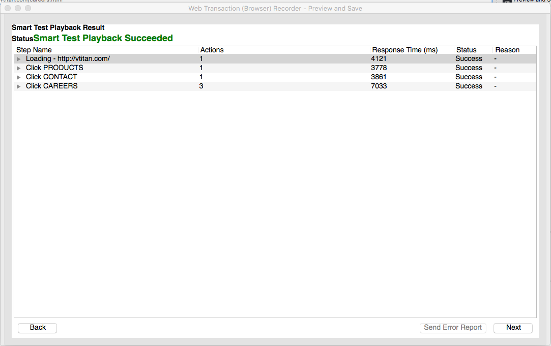 - Once the script has been successfully imported to the Web Transaction (Browser) recorder–verify all the imported steps, list of actions and their respective response times in milliseconds under the Recorded Transactions in Preview and Save screen.