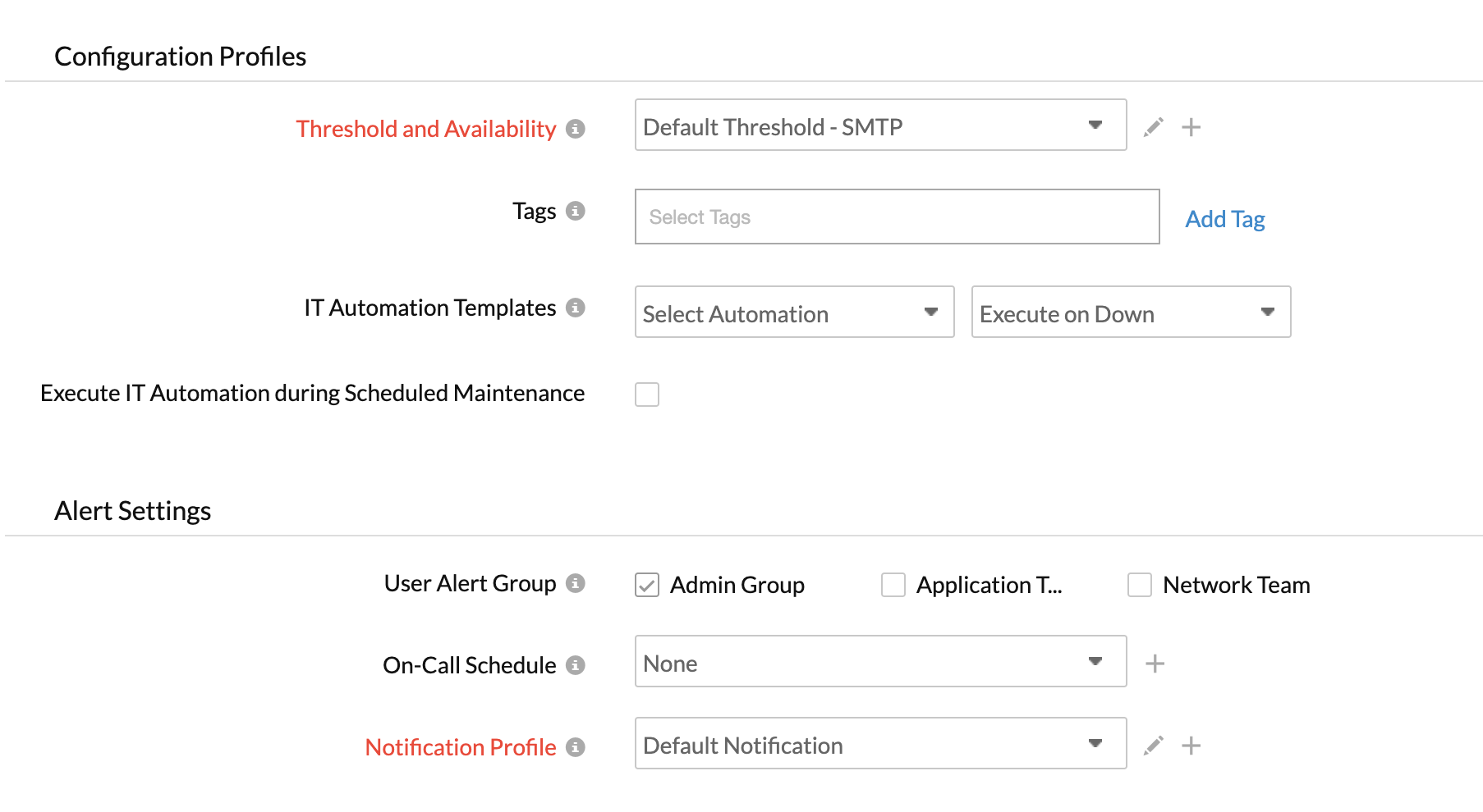 - Notification Profile: Choose a notification profile from the drop down or select the default profile available. Notification profile helps to configure when and who needs to be alerted in case of downtime. Refer Notification Profile to create a customized notification profile.