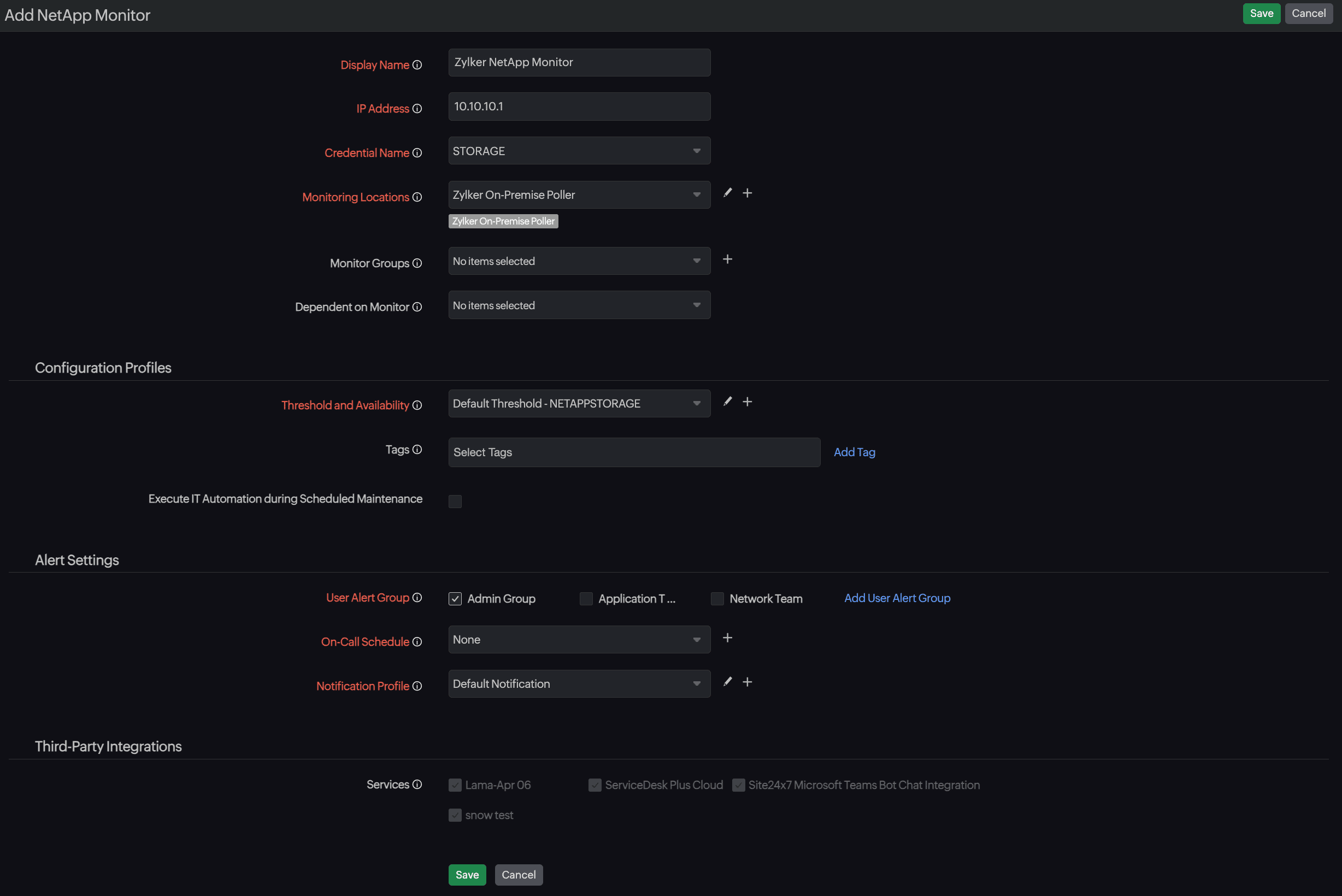 - Before adding a NetApp ONTAP (Cluster) for monitoring, ensure that the device is accessible from the required On-Premise Poller through ICMP ping and HTTPS. Port 443 must be available.