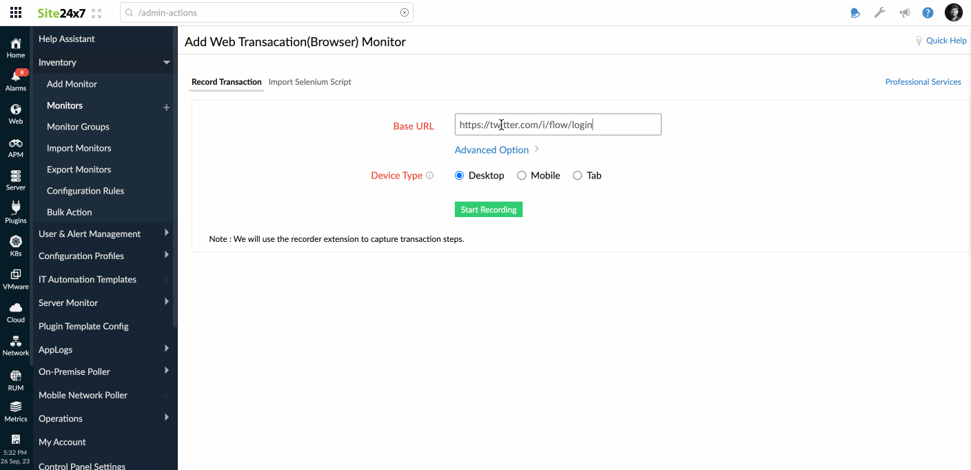 - Select Site24x7 Web Transaction (Browser) Recorder from the list of options.