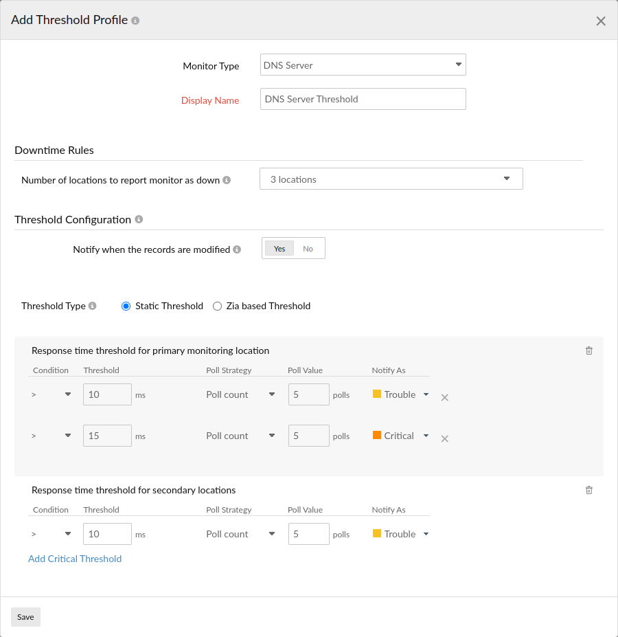- Response time threshold for primary monitoring location: Enter a value in milliseconds to get notified when the response time from primary location crosses the specified value. You can define separate conditions to trigger trouble and critical alerts during breach.