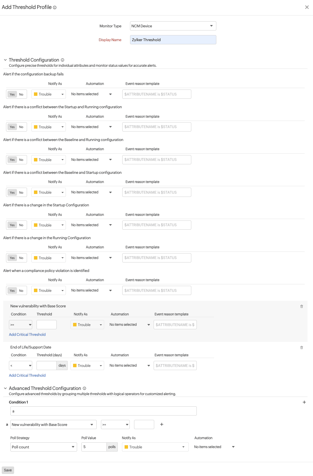 Figure 1. Adding a threshold profile for NCM devices. - Additional settings: For each of these threshold configurations, you can also select an Automation step and an Event reason template.
