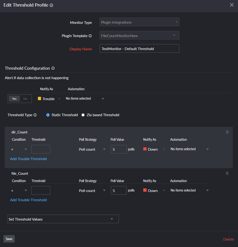 - In the Edit Threshold Profile pop-up, select Yes in the Alert if data collection is not happening field if you want to get notified when data collection for the respective plugin monitor has stopped.