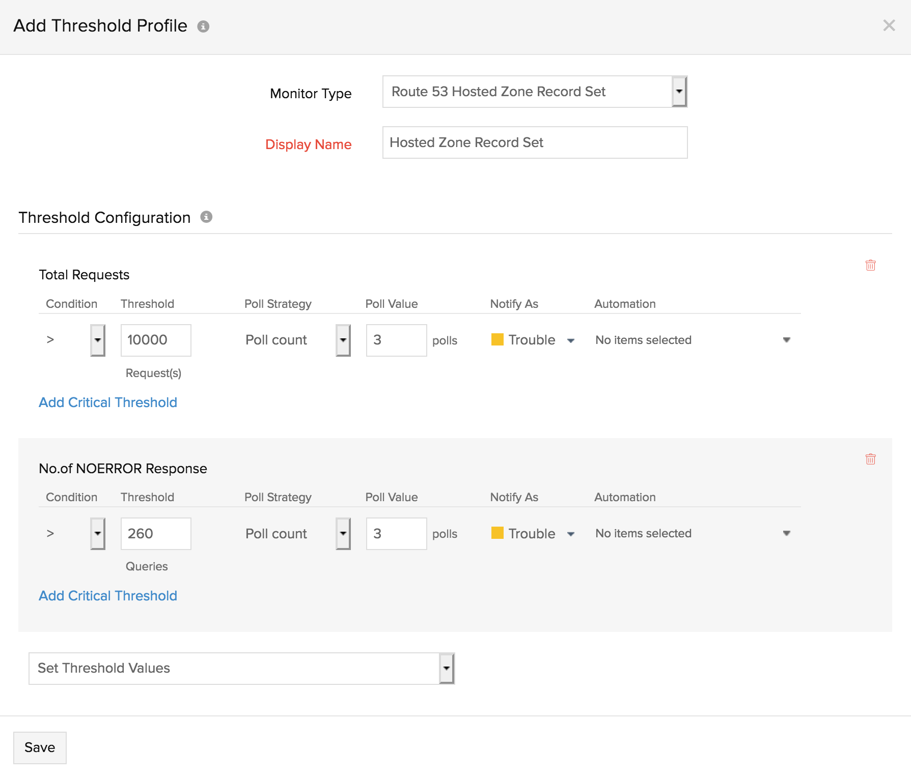 When a new Hosted Zone Record Set monitor is added, it is associated with a default threshold profile. This profile doesn’t contain any pre populated thresholds attached with it. You can either edit the default threshold profile or create yourself a new one.