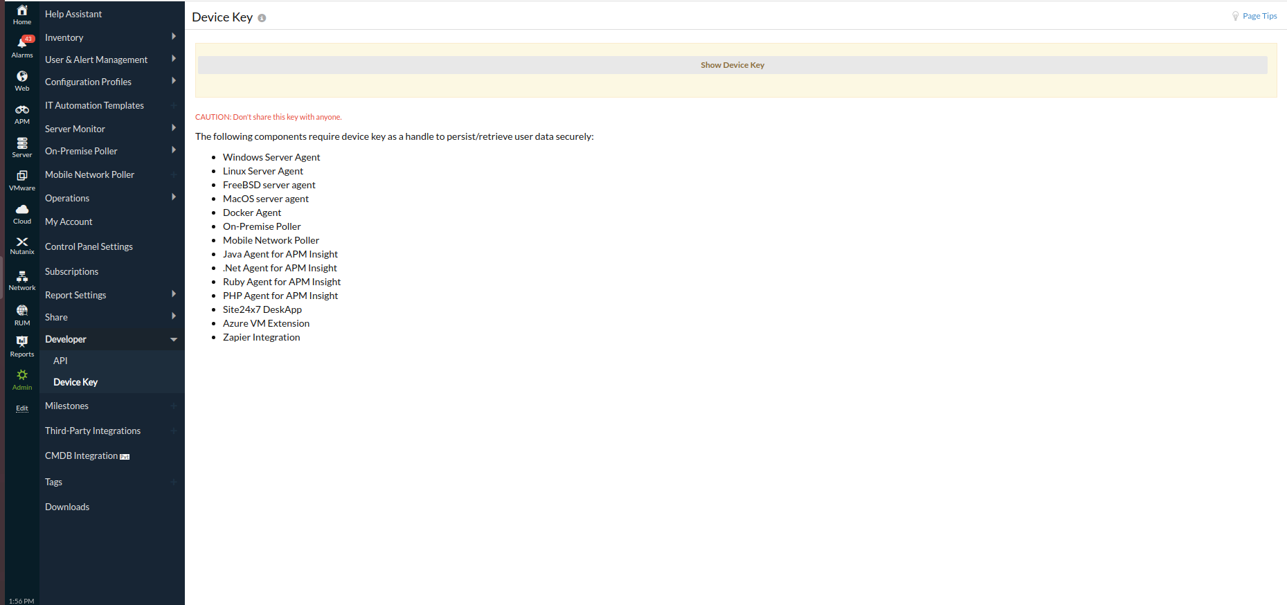 - Log in to Site24x7 and go to Admin > Developer > Device Key.