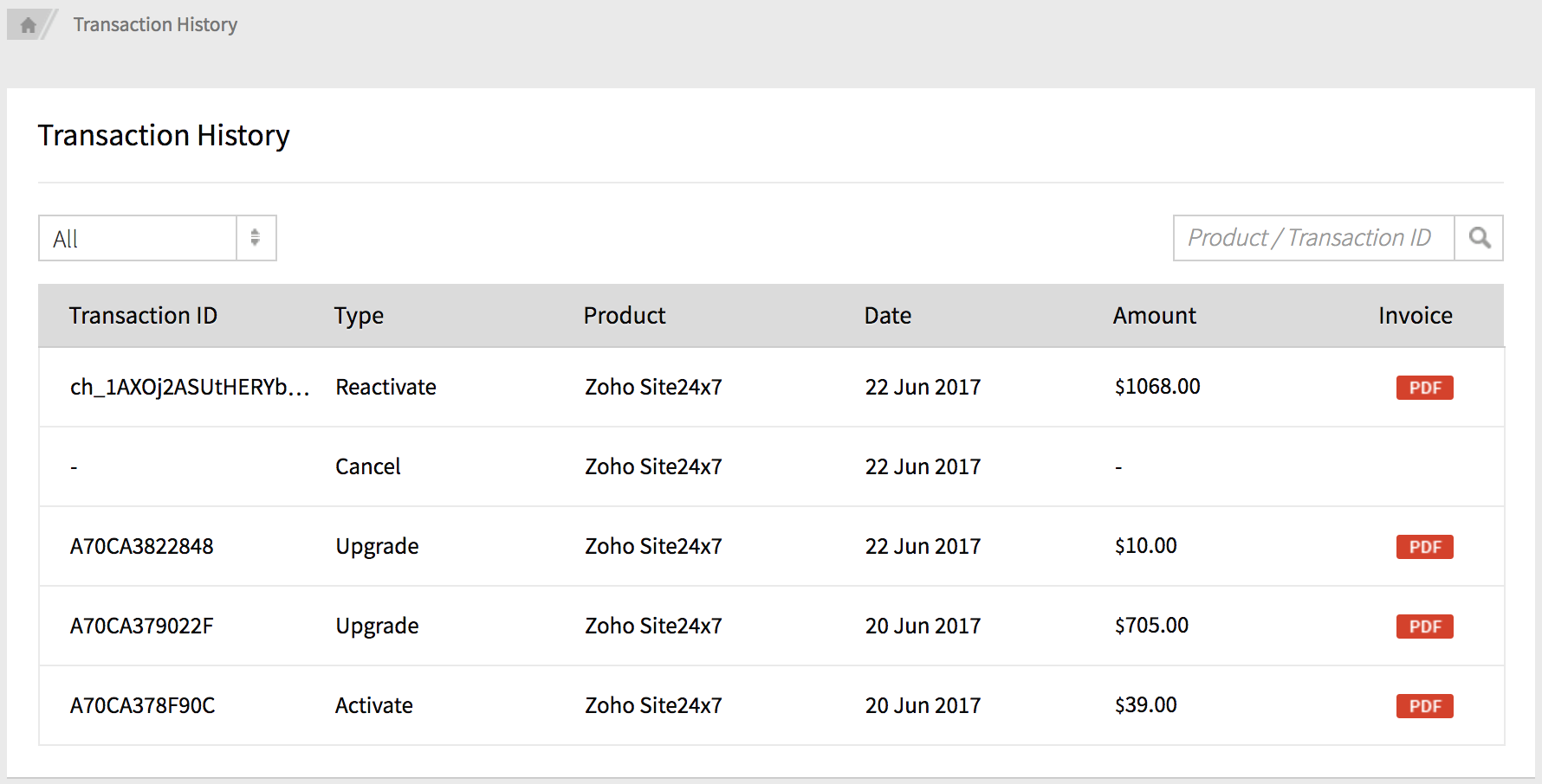 - Click the relevant PDF file listed under the Invoice column to download the invoice.
