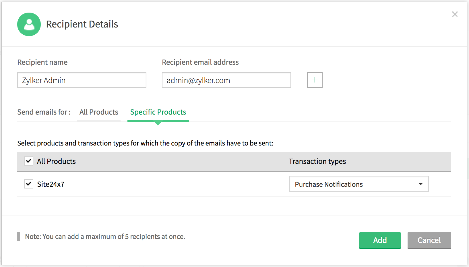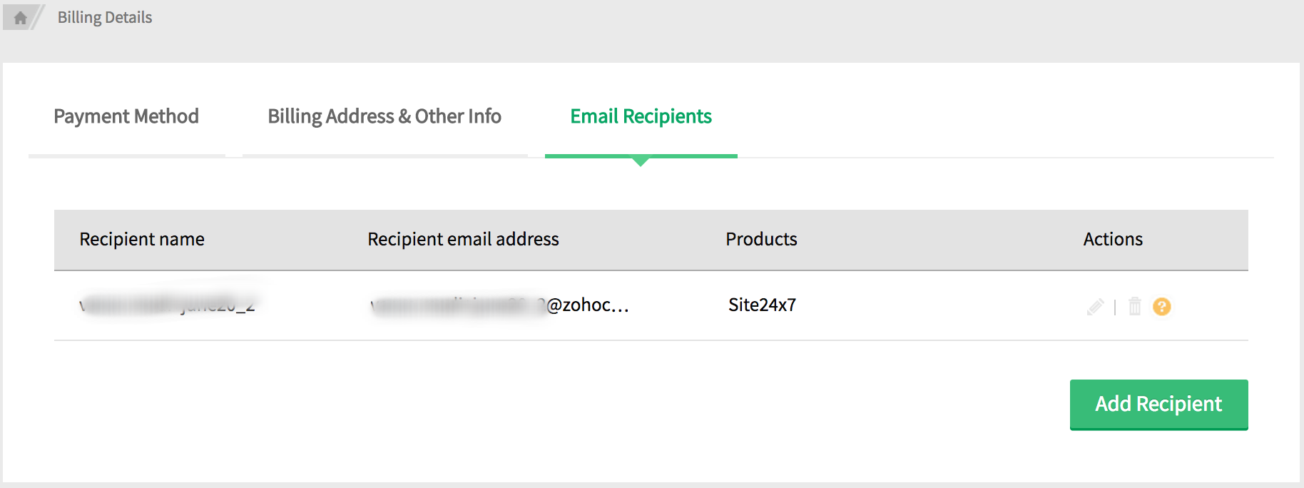- You can share purchase notifications and invoice details with your colleagues. If you wish to add more email recipients, select the Email Recipients tab and click the Add Recipient button.
