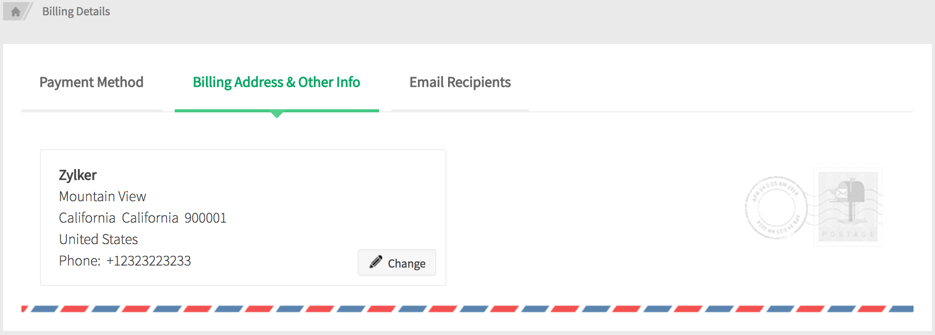 - To alter your Billing address, access the Billing Address & other info tab and click Change. Once you've modified your new billing address, click Update.
