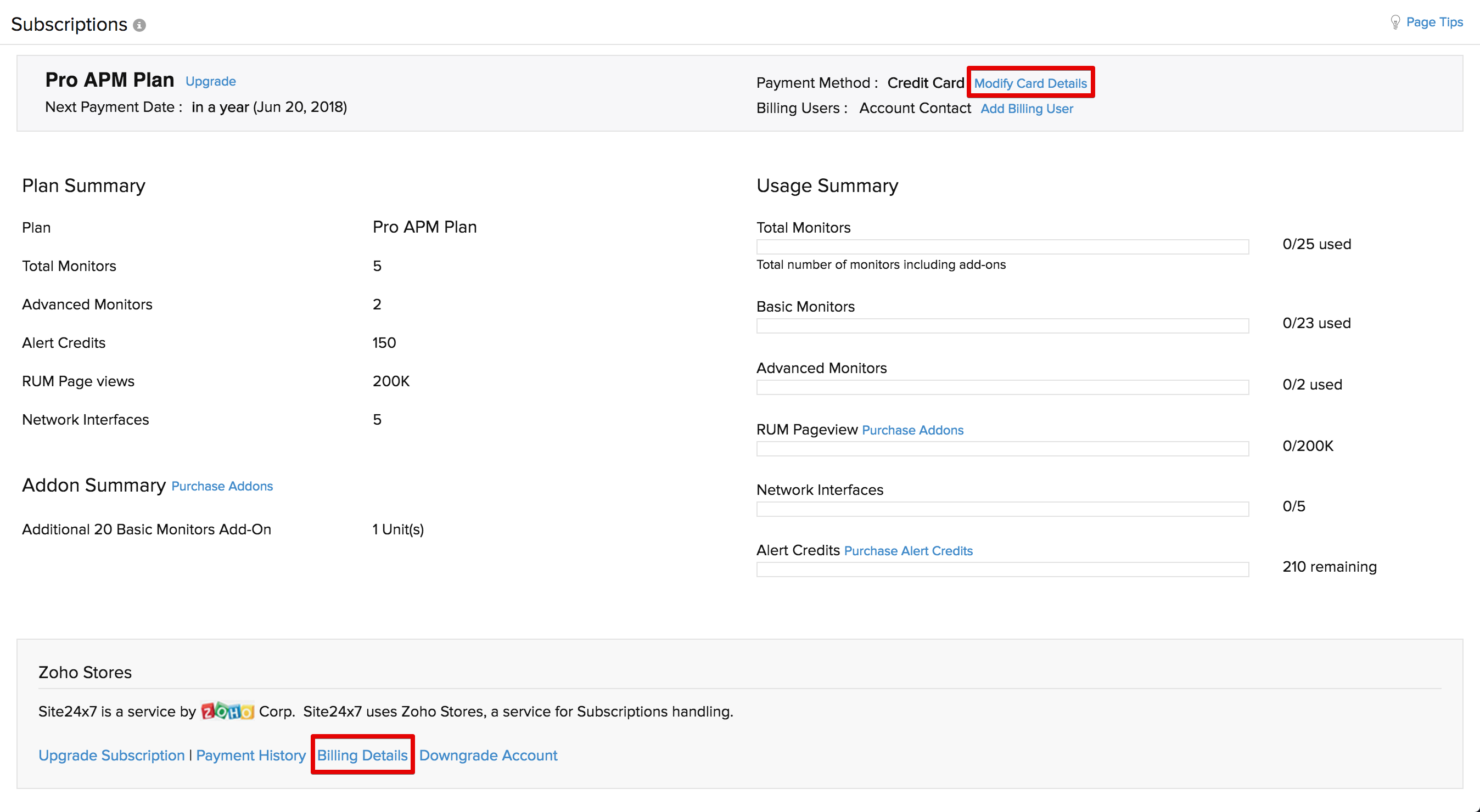 - Click Modify Card Details or Billing Details. You'll now be redirected to the Billing Details window in Zoho Stores.