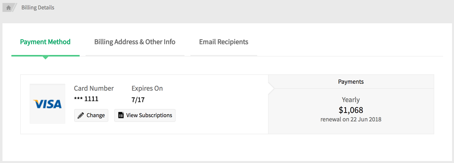 - Under Payment Method tab, click Change icon. Provide the new card details and click Update. You can also view the Current Subscription Plan by clicking the View Subscription button.