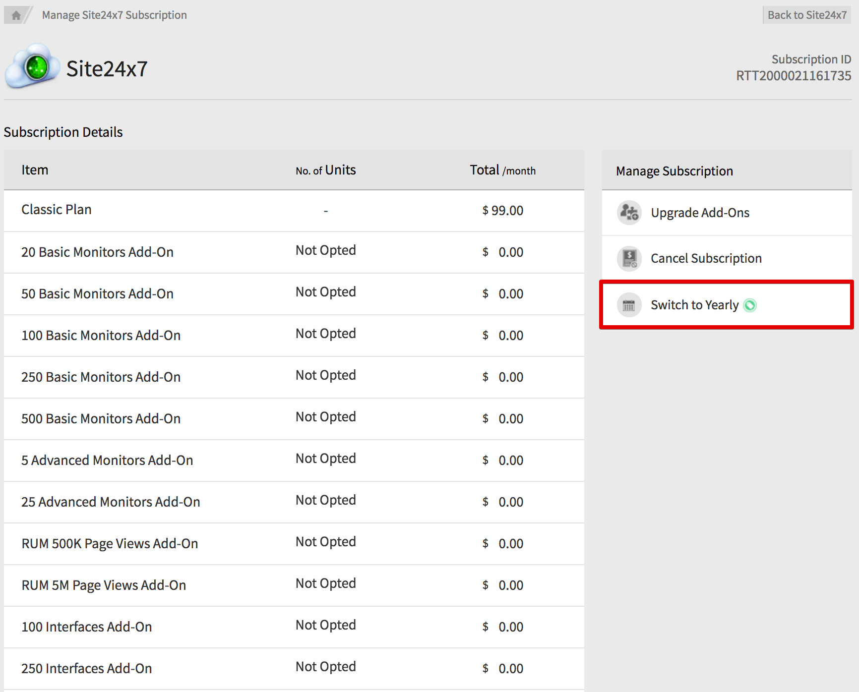 - Click Upgrade Subscription. You'll redirected to the Manage Site24x7 Subscription window.