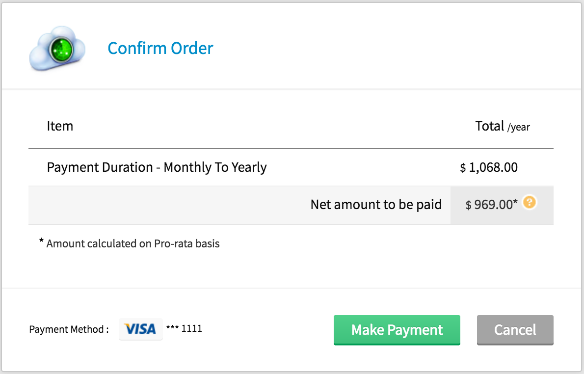 - You'll be prompted with a Confirm Order window. Click the Make Payment button to change the subscription plan from monthly to yearly.