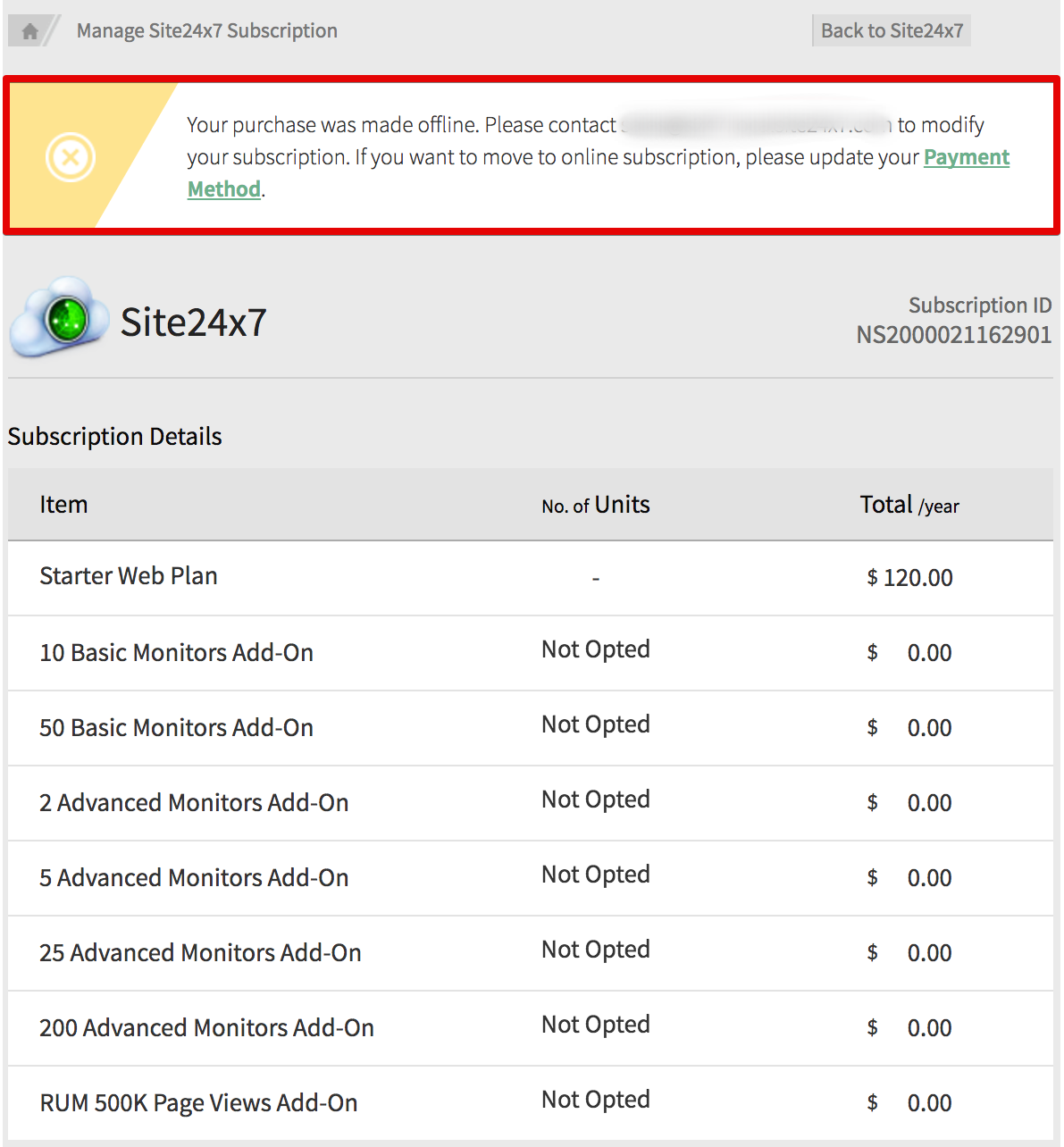 NoteYou will be navigated to the Manage Site24x7 Subscription page, where you are provided a notification message to convert to an online subscription mode. - Click the highlighted link Payment Method to automatically convert from a PO subscription to an online subscription mode.
