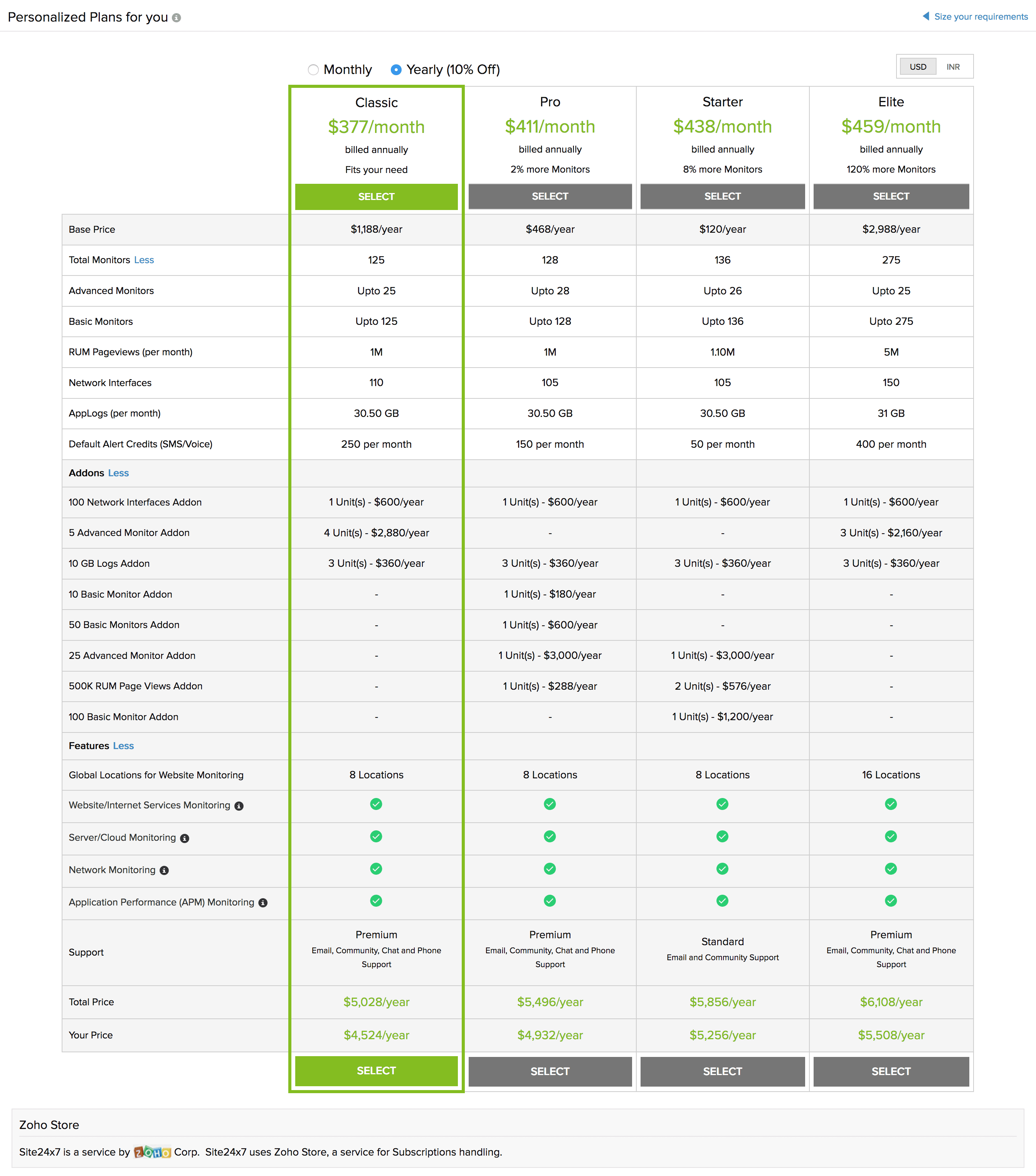 - Based on your specified suggestions, get personalized plans from Site24x7 that fits your need. Select a desired plan. Based on the logged in IP address, you'll be provided multiple currency options for payment. Learn more about the available currency options.