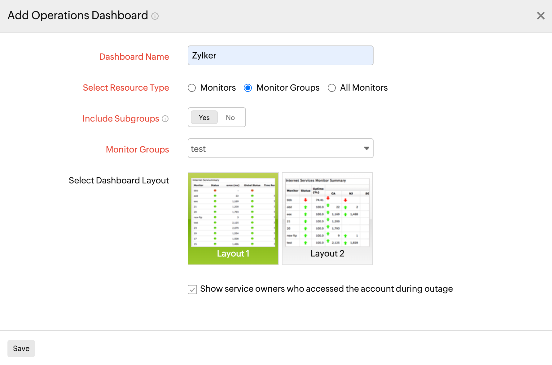 • Select Resource Type: Select the required monitors or monitor groups from the dropdown list for which you need a dashboard view for.