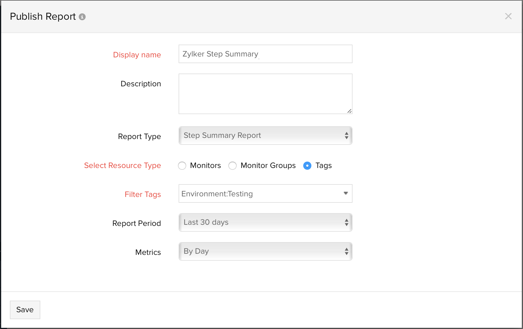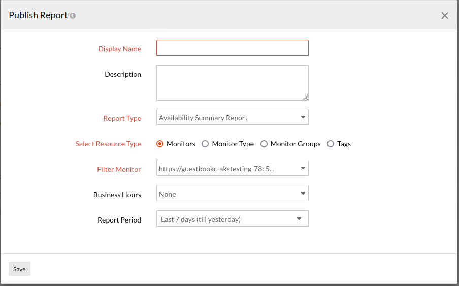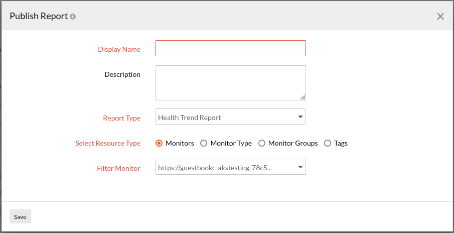 • Select Resource Type: Select the required monitors, monitor groups, or tags radio button to make the reports public. Specify the relevant Monitor(s), Monitor Group(s), Monitor Types, or Tag(s) for which the reports are to be published.
