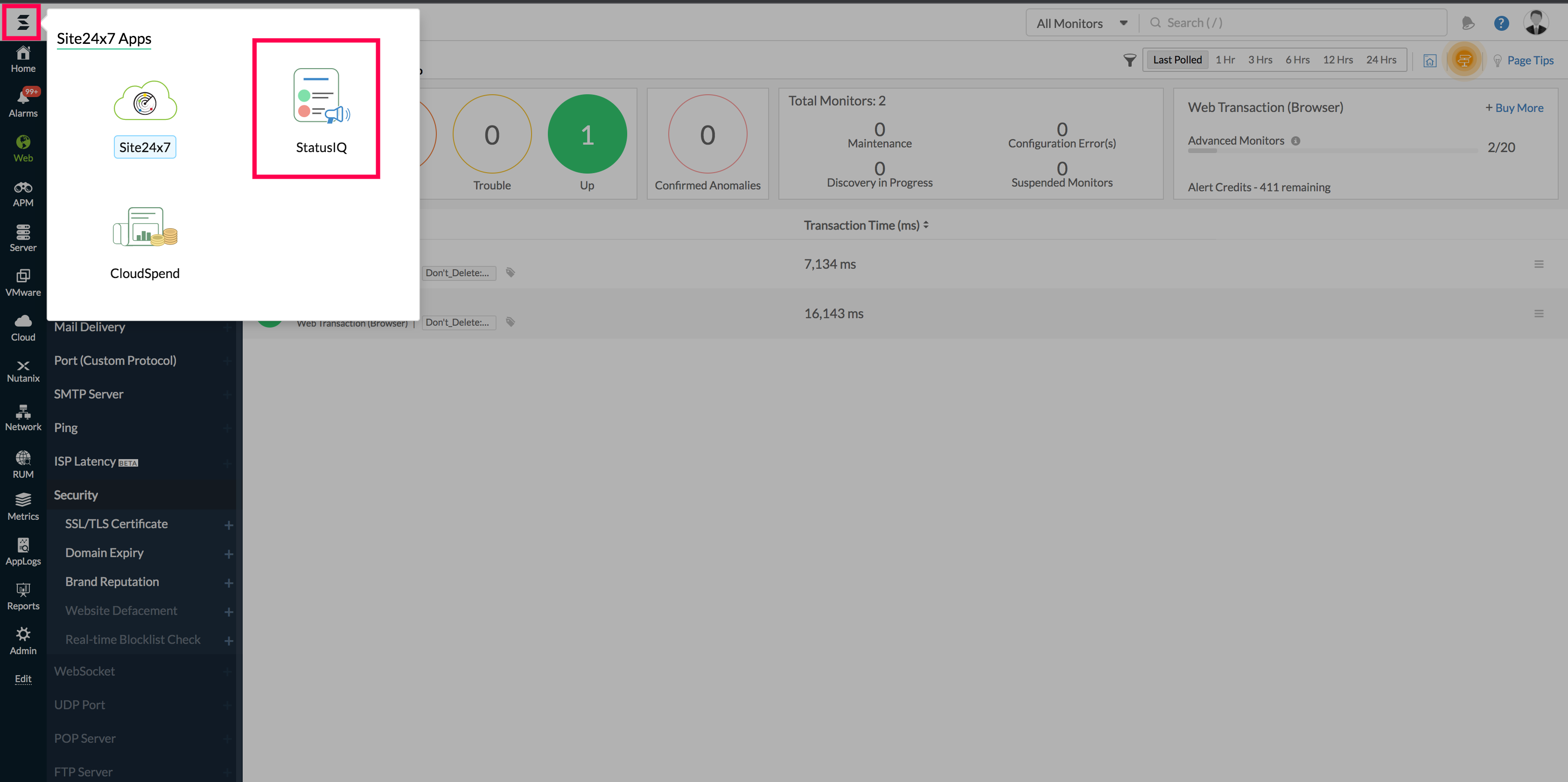 All status pages are now migrated to StatusIQ. Use the Access StatusIQ button to create new status pages or manage existing ones. You can also access StatusIQ using the product icon at the top left corner of the web client as shown below: