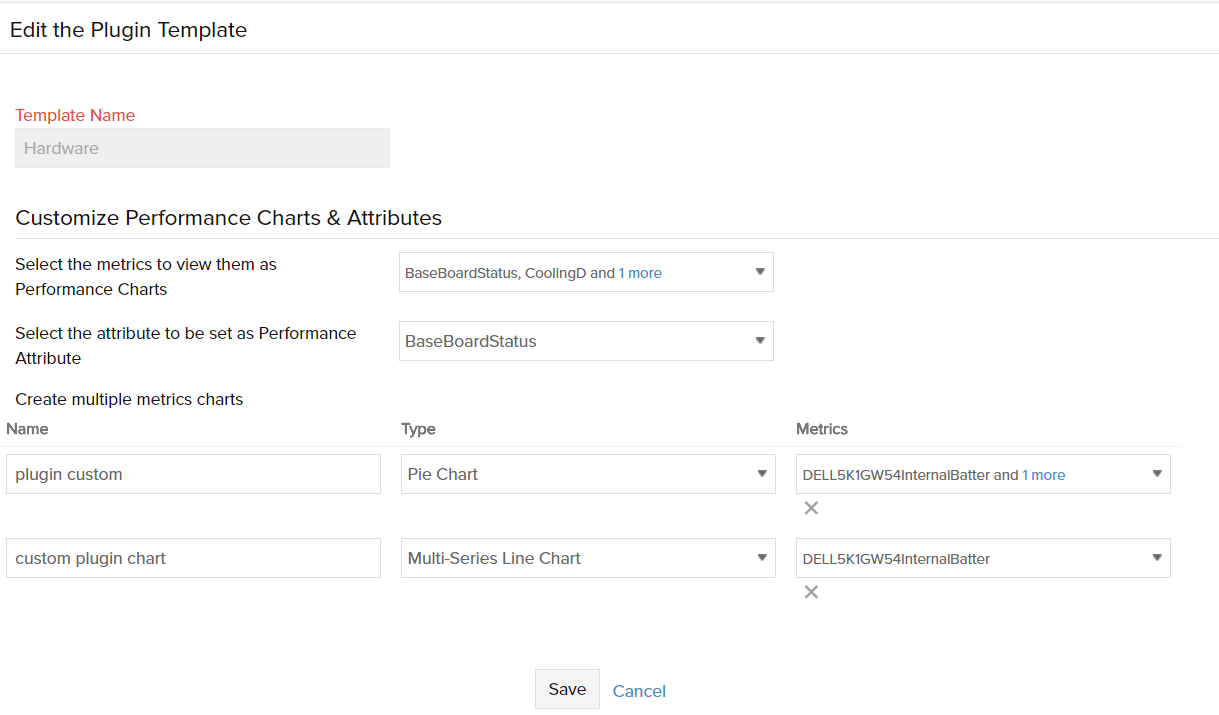 A plugin template is a user-customized monitor type using which you can define the attributes with units you wish to monitor. The keys present in the plugin's JSON output will be the attributes for the plugin template. Using a plugin template, users can customize the performance charts by choosing related attributes and then showcase the charts on the plugin monitor details page.