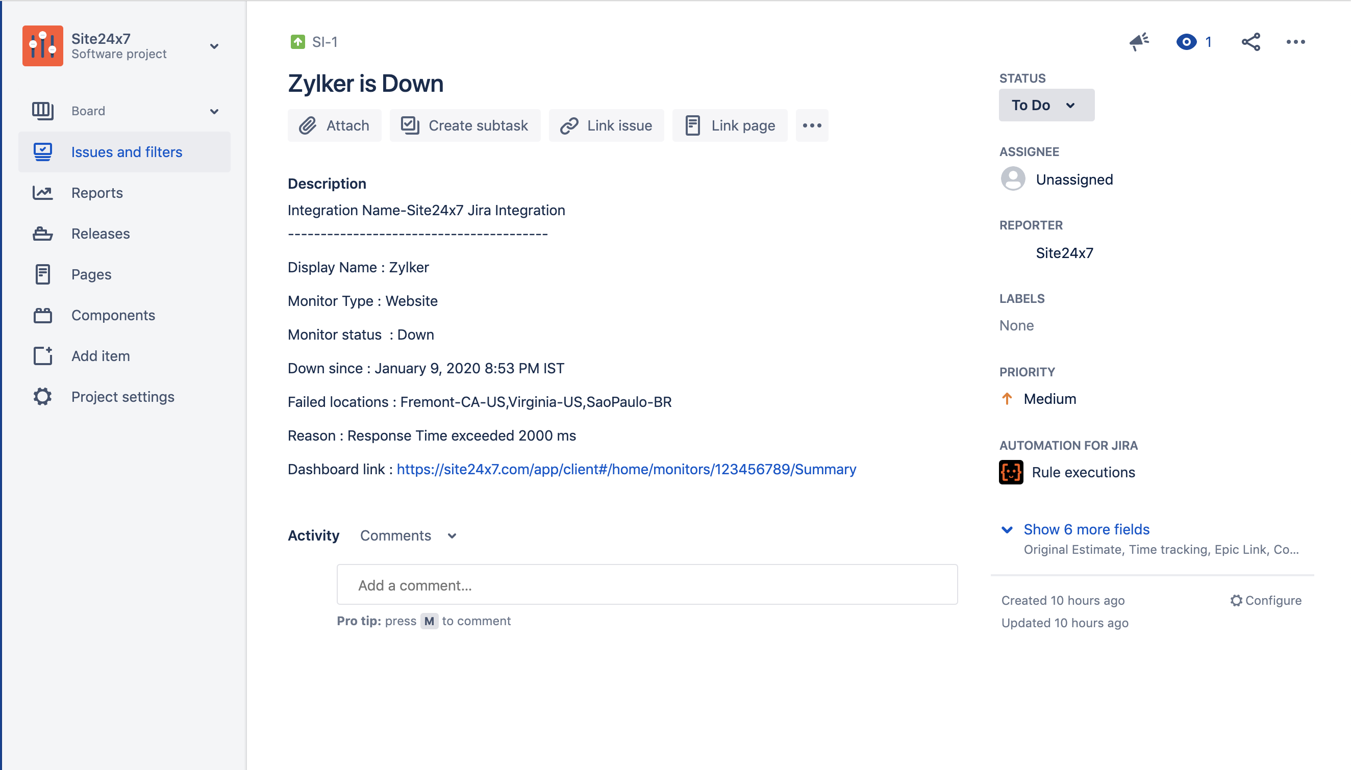 This is how alerts raised in Site24x7 will appear as issues in Jira.