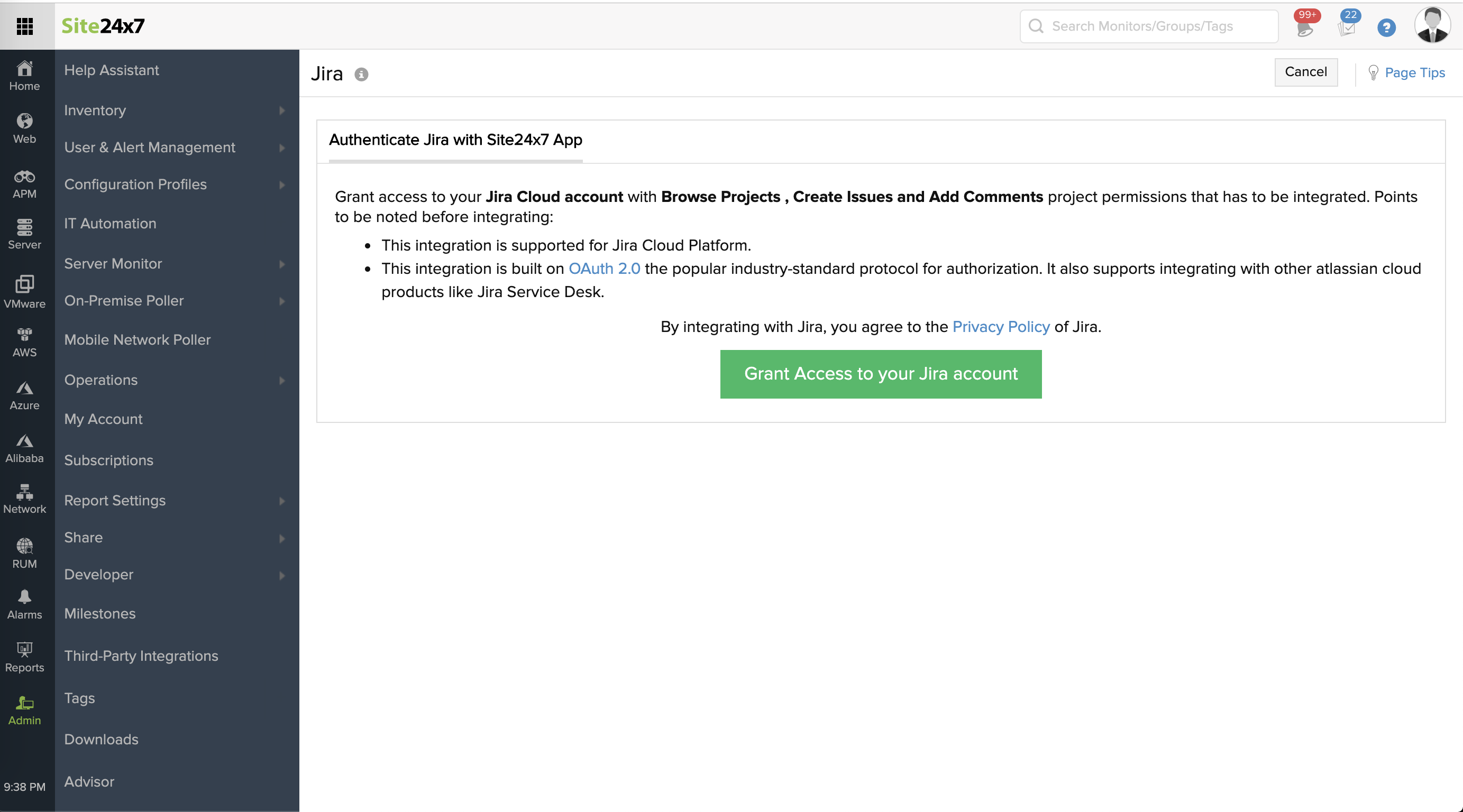 Site24x7 supports integration with Jira through OAUTH 2.0, the popular industry standard protocol for authorization.To set up the integration: