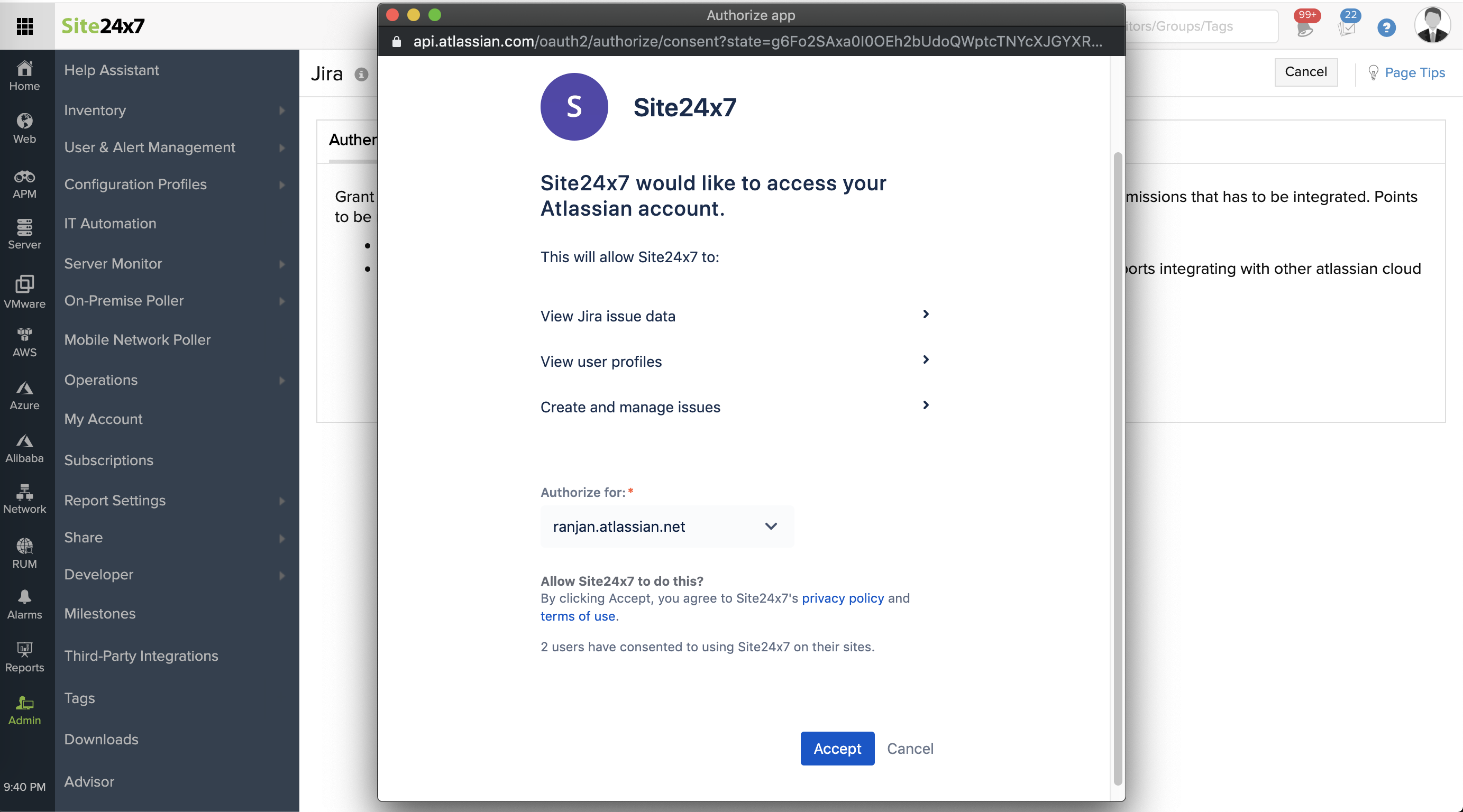 - Log in to your Jira Account. In the Consent pop-up that opens, click on Accept to integrate your Site24x7 account with your Jira account.