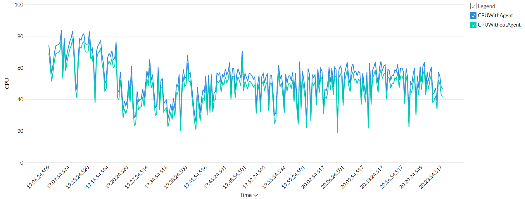 With the default production settings, the APM Insight .NET Agent does not consume more than 5~10 % CPU on average (using default production settings). The CPU usage depends mainly on the number of methods instrumented (using custom instrumentation) and the log level (default is CRITICAL). The maximum consumption will be during the application startup or domain creation, since it involves initializing profiler and loading .NET Agent's libraries. Once initialized, the average overhead due to .NET Agent, remains at around 5% in addition to the normal CPU usage of the web application.