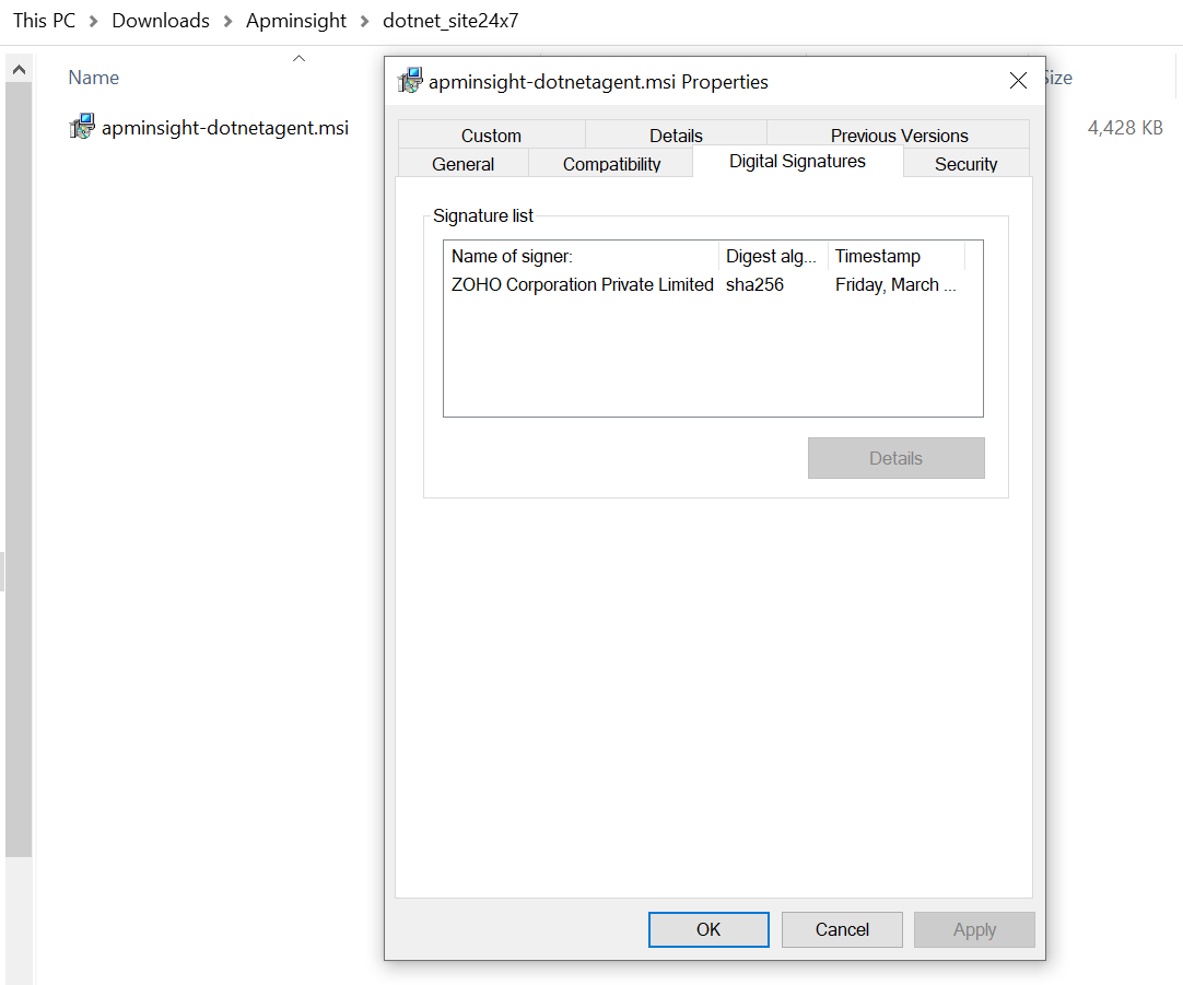 You can verify the authenticity of the downloaded Site24x7 agent with SHA256 checksum validation. This ensures that the downloaded agent is credible and is not tampered with by any malicious code or software. For the .NET agent, you can use CertUtil or Get-FileHash to compute a file hash for verifying the checksum with the agent checksum value. To verify the authenticity of the agent: