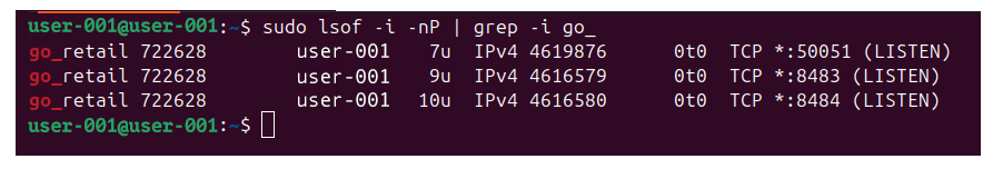 go_retail 722628 user-001 7u IPv4 4619876 0t0 TCP *:50051 (LISTEN)