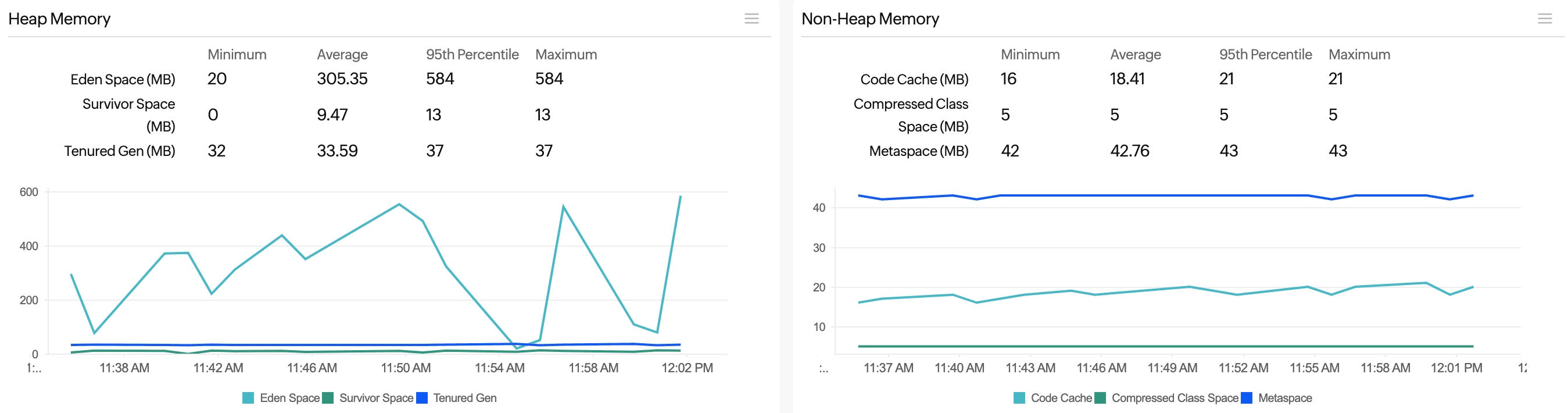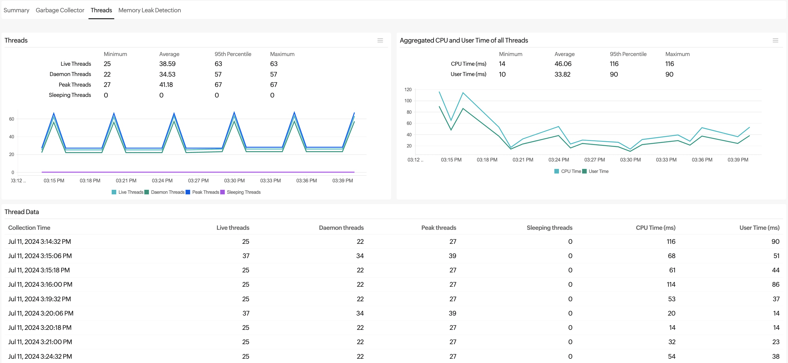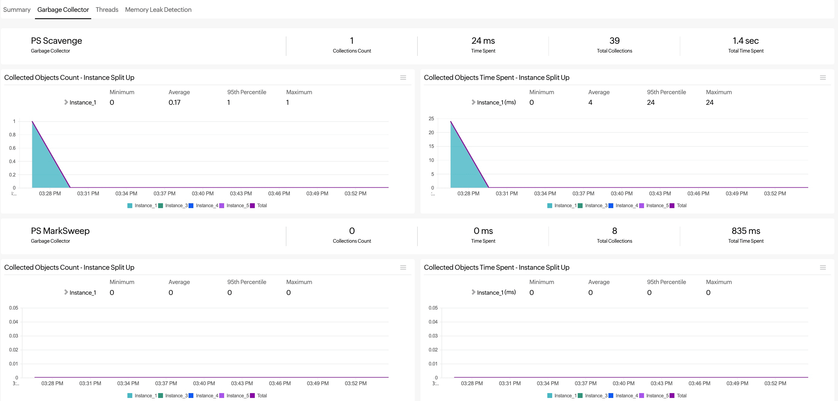 This tab provides insights into the behavior and performance of the JVM's garbage collection processes. The garbage collection metrics help you gain insights into the objects the JVM collects for cleanup.