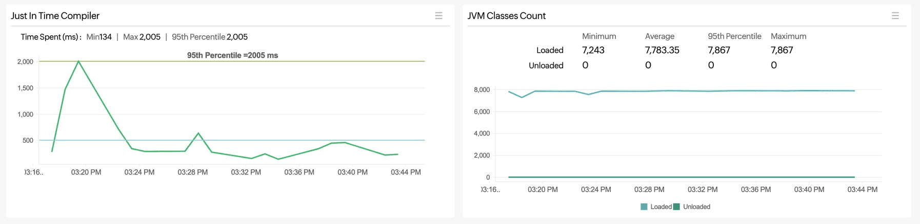 Gain useful insights into runtime data to troubleshoot performance issues and monitor your application's health with Java Virtual Machine (JVM) metrics. The Site24x7 APM Insight Java agent captures JVM metrics by default.
