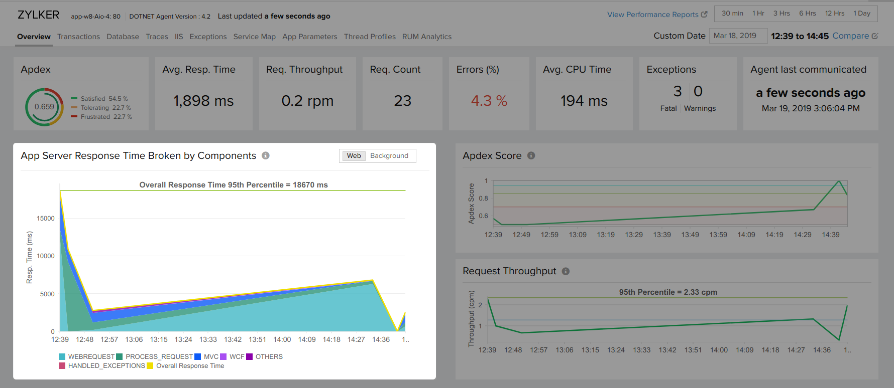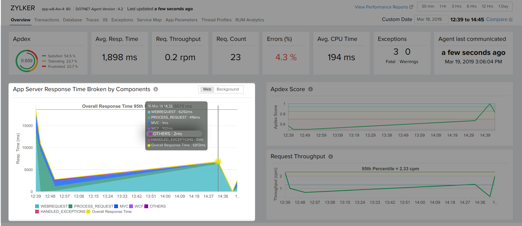 Note: The maximum number of unique components tracked by the agent is 15. If the component count exceeds 15, response time of other components are shown as "Others". Also, time spent in waiting for resources, say time taken to initiate a DB request, is included in "Others".