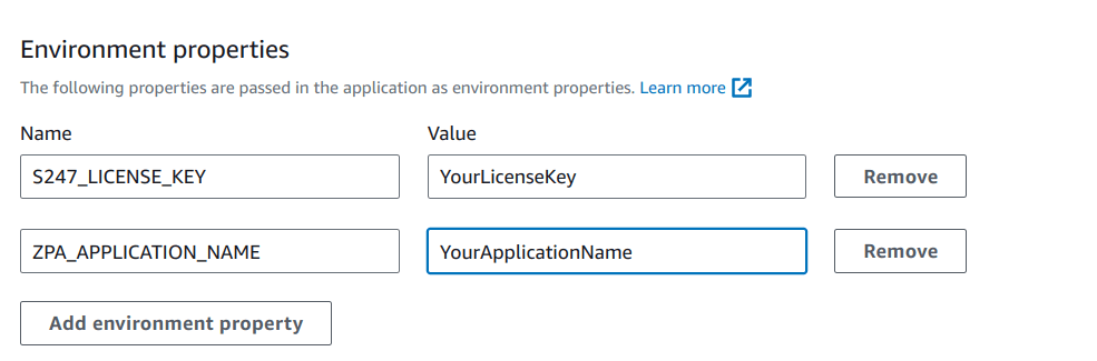 - Edit your Elastic Beanstalk application configuration and add the following environment properties: