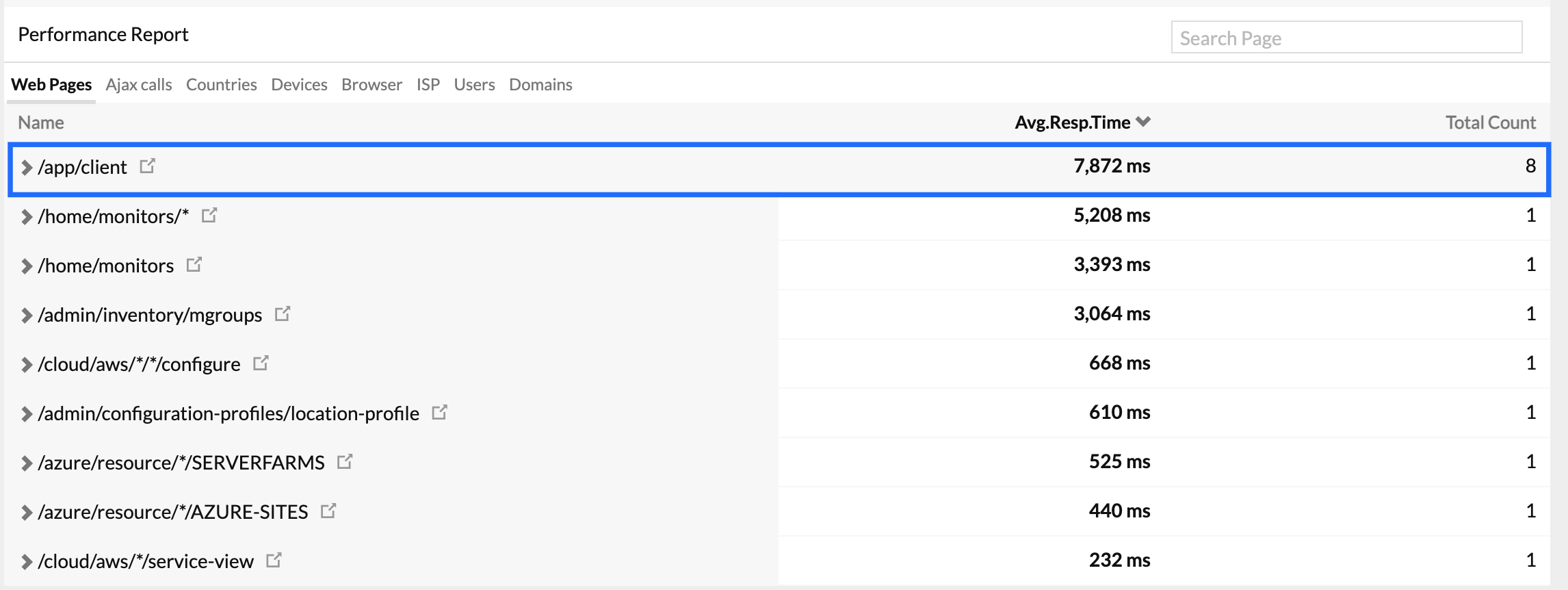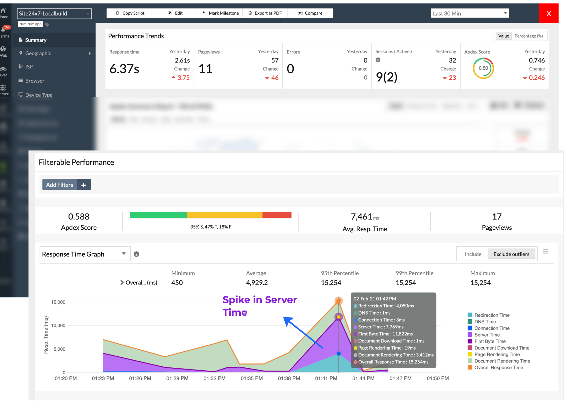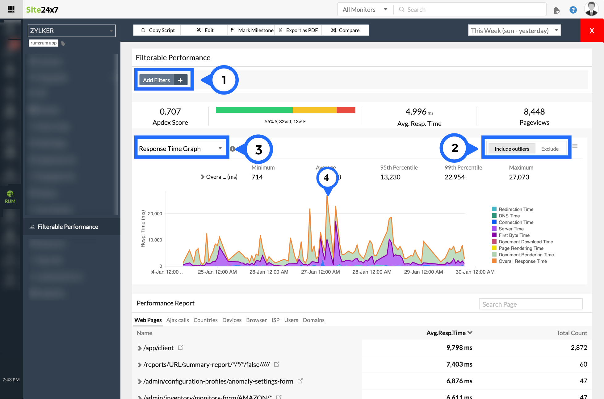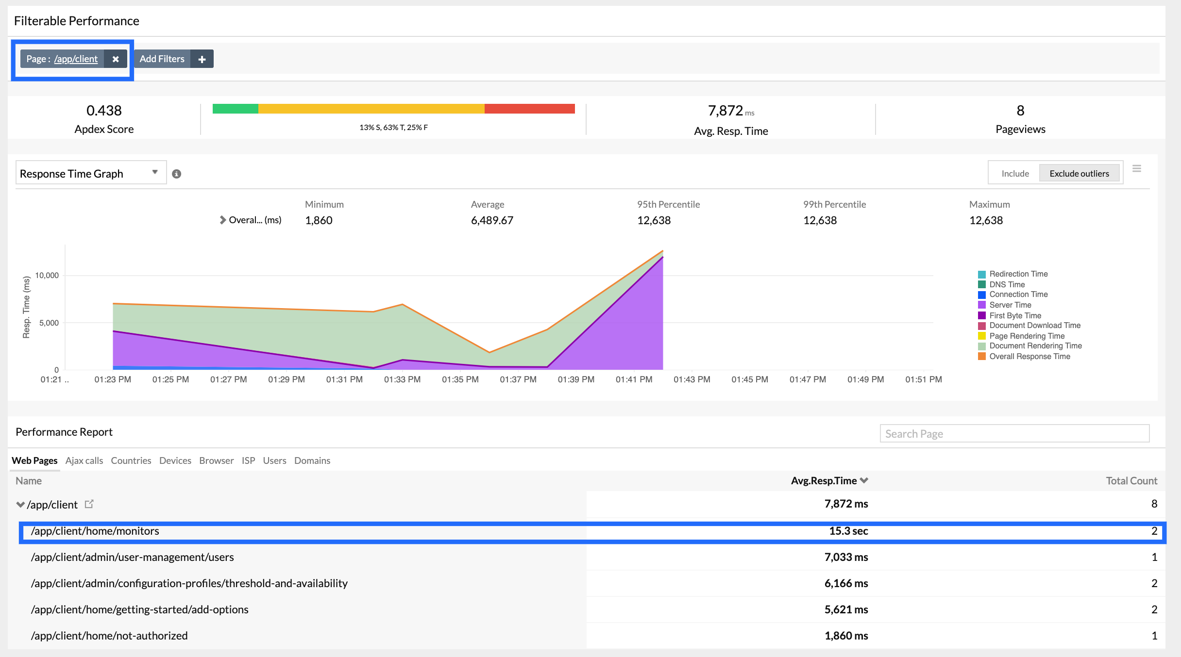 - Click on Add Filters to drill down into performance based on browser, users, devices, country, and ISP. You can also filter and view the performance of individual webpages or Ajax calls.