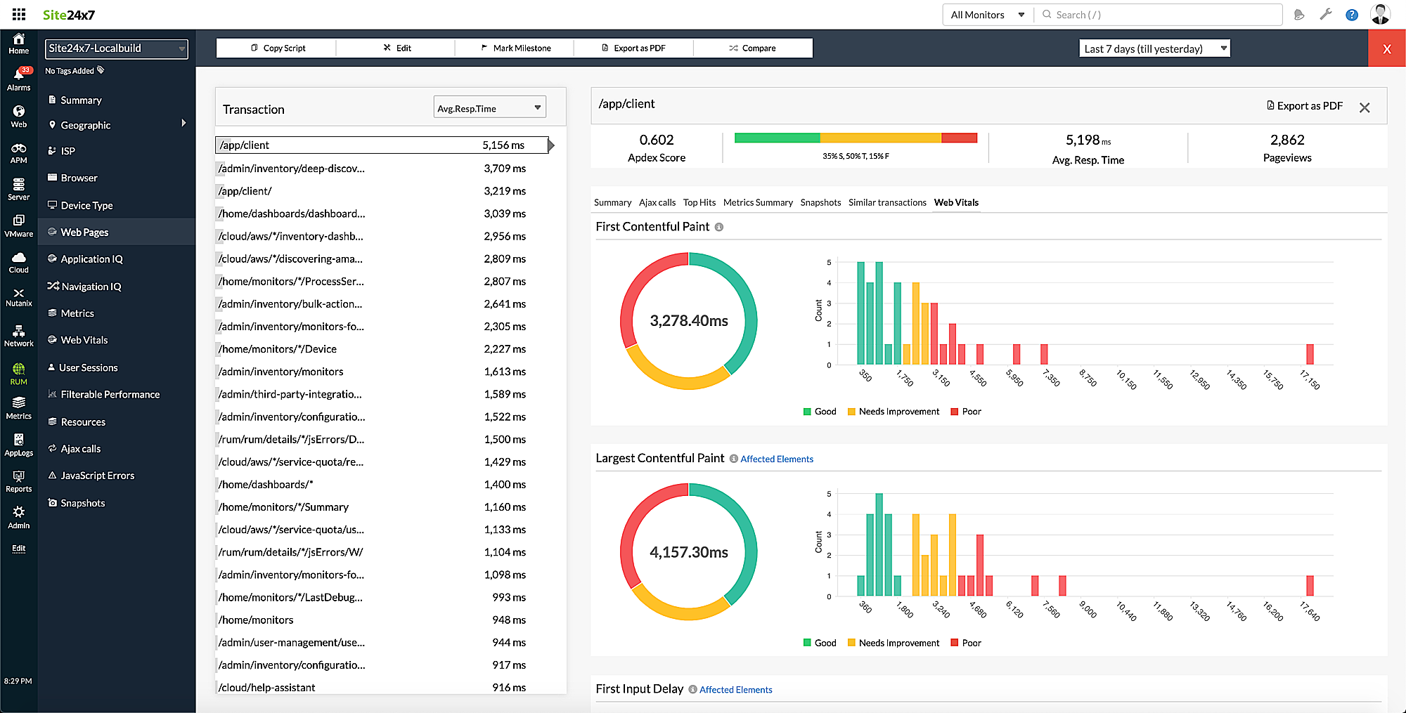 Log in to your Site24x7 account > RUM > Your application > Web Pages. Click the required transaction to get the split-up and histogram distribution of all the web vitals.
