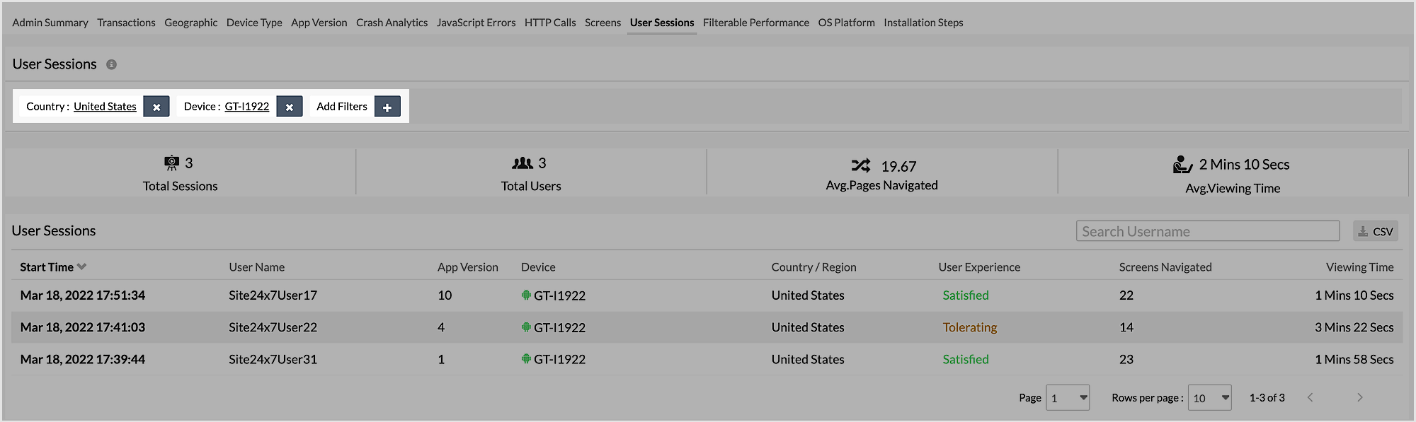 The top band displays the total number of sessions, the total number of users, the average number of pages navigated, and average viewing time. The list of User Sessions is also shown below along with their respective metrics: User Name, App Version, Device, Country/Region, User Experience, Screen Navigated, and Viewing Time.