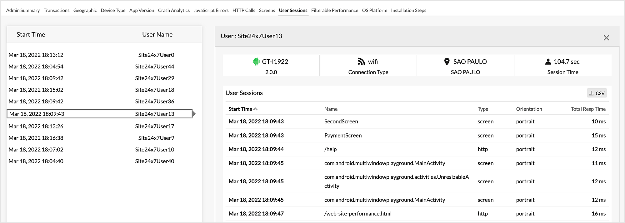 2. Click an individual session to inspect further details like sessions accessed by that user, the time taken for each session, and the response time of the screen accessed by the user.