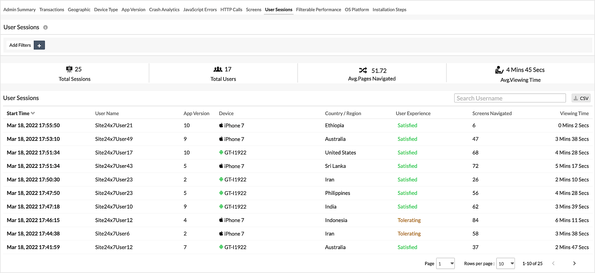 You can also filter user sessions based on user ID, device type, country, app version, OS version, platform, and connection type. This helps you inspect user-specific or region-specific issues and determine their root cause effectively.