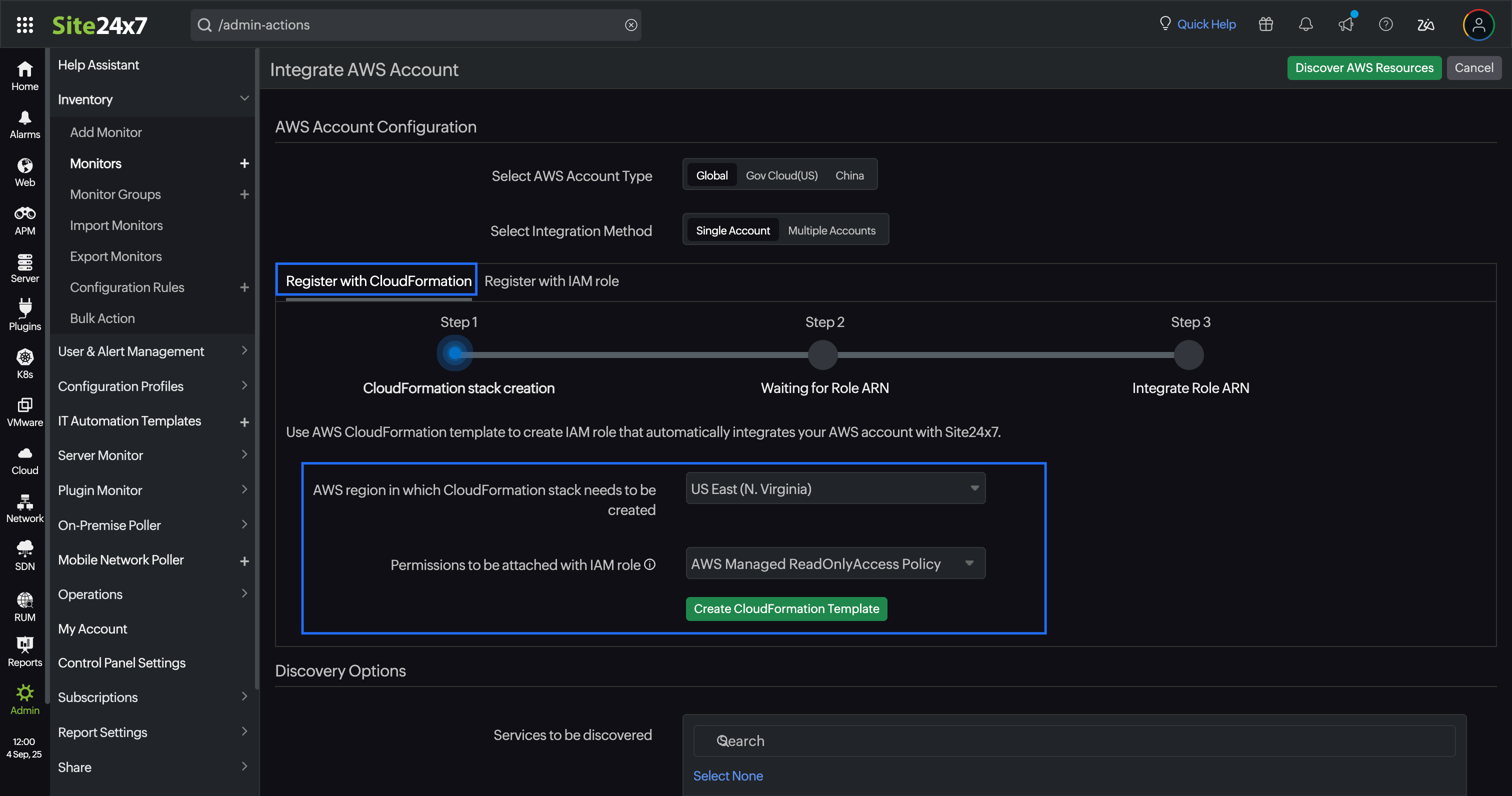 Integrate your AWS account with Site24x7 using a CloudFormation template