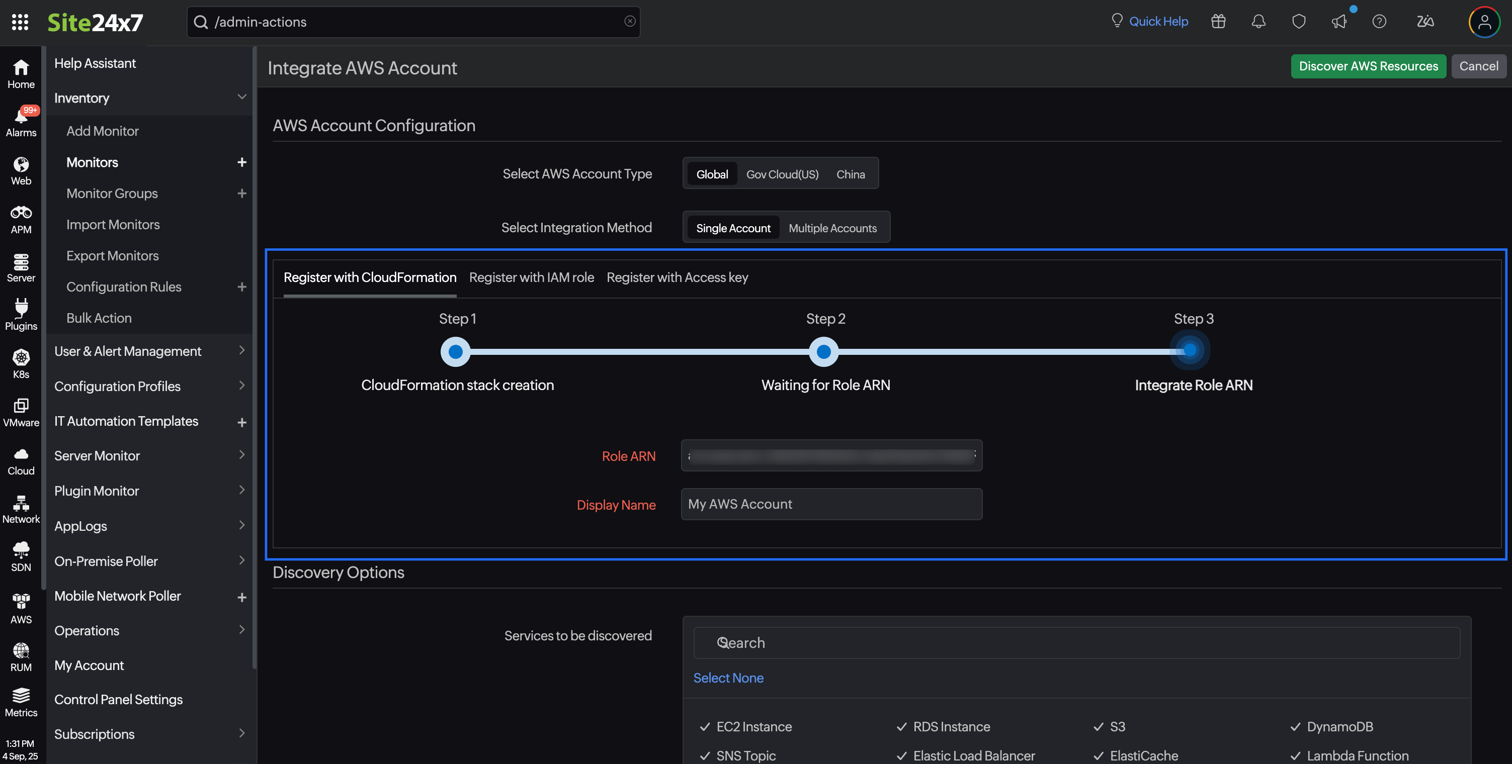 To integrate your AWS account with Site24x7 using a CloudFormation template, follow the steps below: