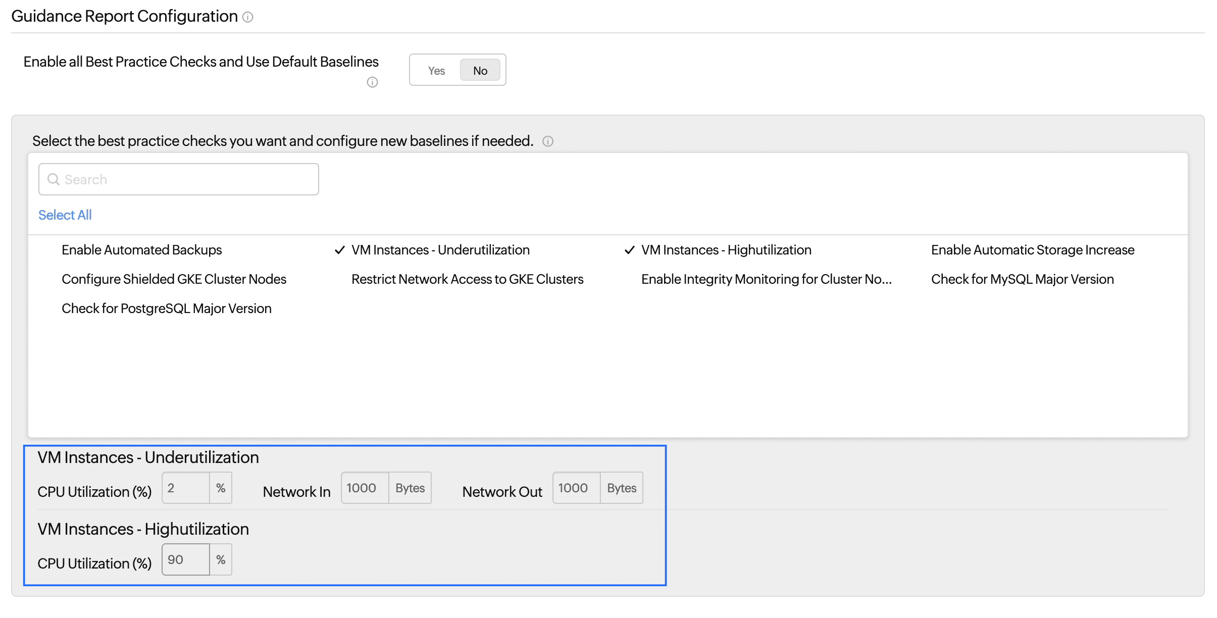 Site24x7's Guidance Report analyzes your GCP account using our best practice recommendation checks and provides insights to reduce costs and improve performance. If you want to enable all checks and use default baselines, keep the toggle at Yes. If you're going to choose the recommendations and configure custom baselines (only applicable for the following checks: VM Instances - Underutilization and VM Instances - Highutilization) toggle the option to No