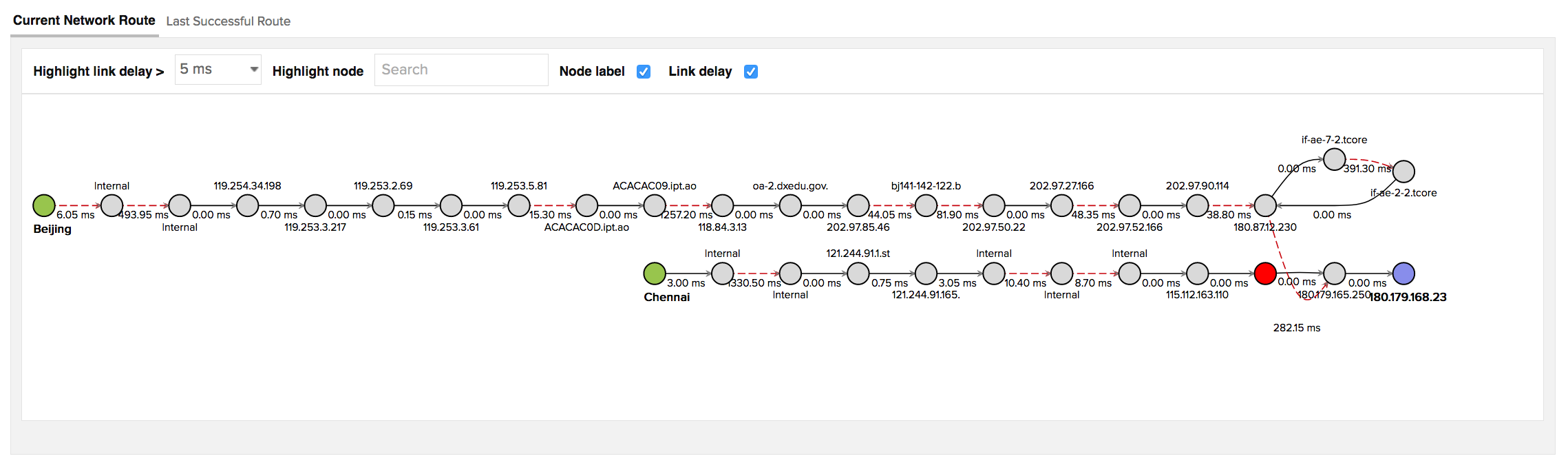 The last successful route lets you view and analyze the previous successful route when the destination IP was successfully resolved. You can gather the various performance attributes, like packet loss and latencies at different hops and link delays between two successive nodes. You can use this data to correlate latency issues and other performance attributes at a specific node, during an outage.