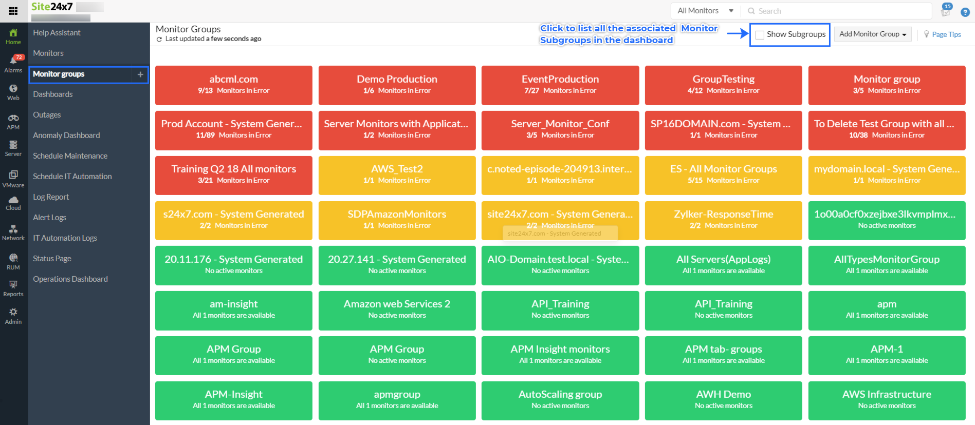 Monitor Groups help you organize resources (Monitors) by business application, geography, type or resource ownership. It's a handy concept for easy administration. You can also easily access all the monitors from a single dashboard without too much navigation. It identifies each groups based on their status color codes. Down monitors are grouped in red. Golden identifies monitors in trouble state. Monitors that are under maintenance are grouped under purple. All available monitors are shown in green. Monitors that are suspended are shown in grey.