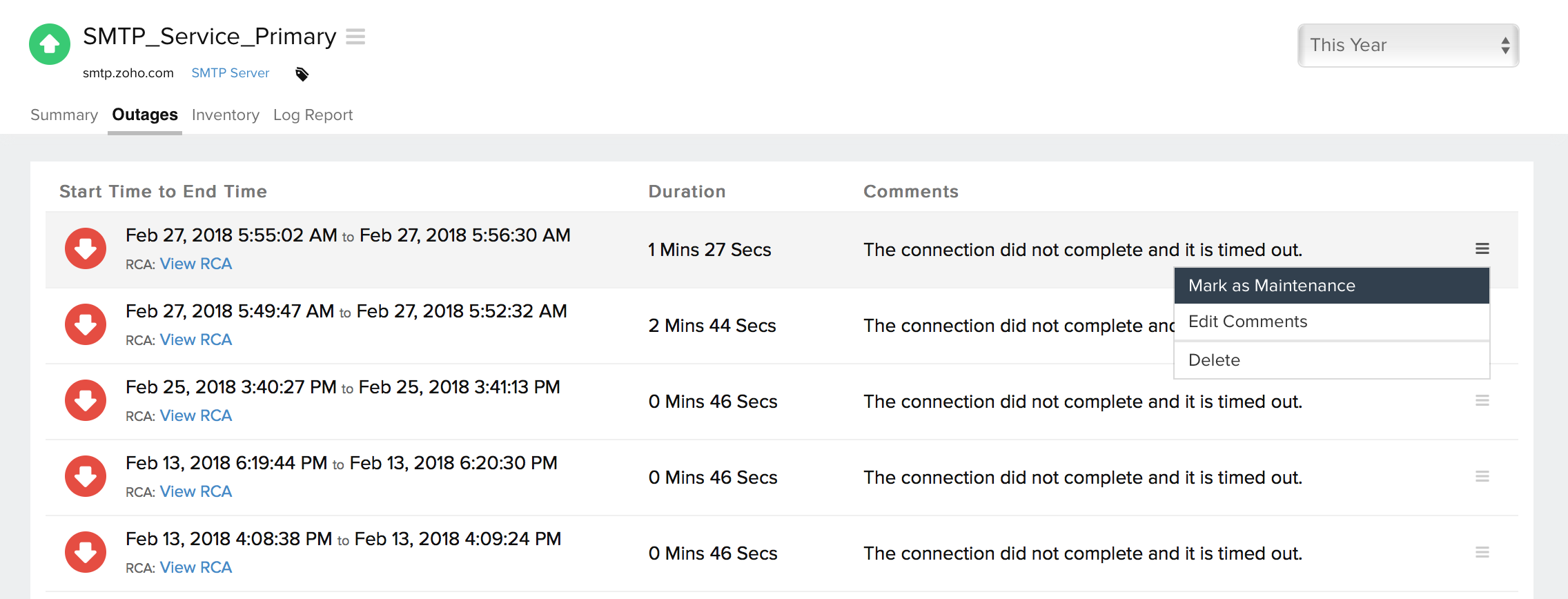You can access the Outages tab in your monitor's details page to gather detailed insights on the various outage and maintenance downtimes. It provides you with sufficient information to troubleshoot issues. You'll also be able to access the root cause analysis reports for your various outages. On accessing the