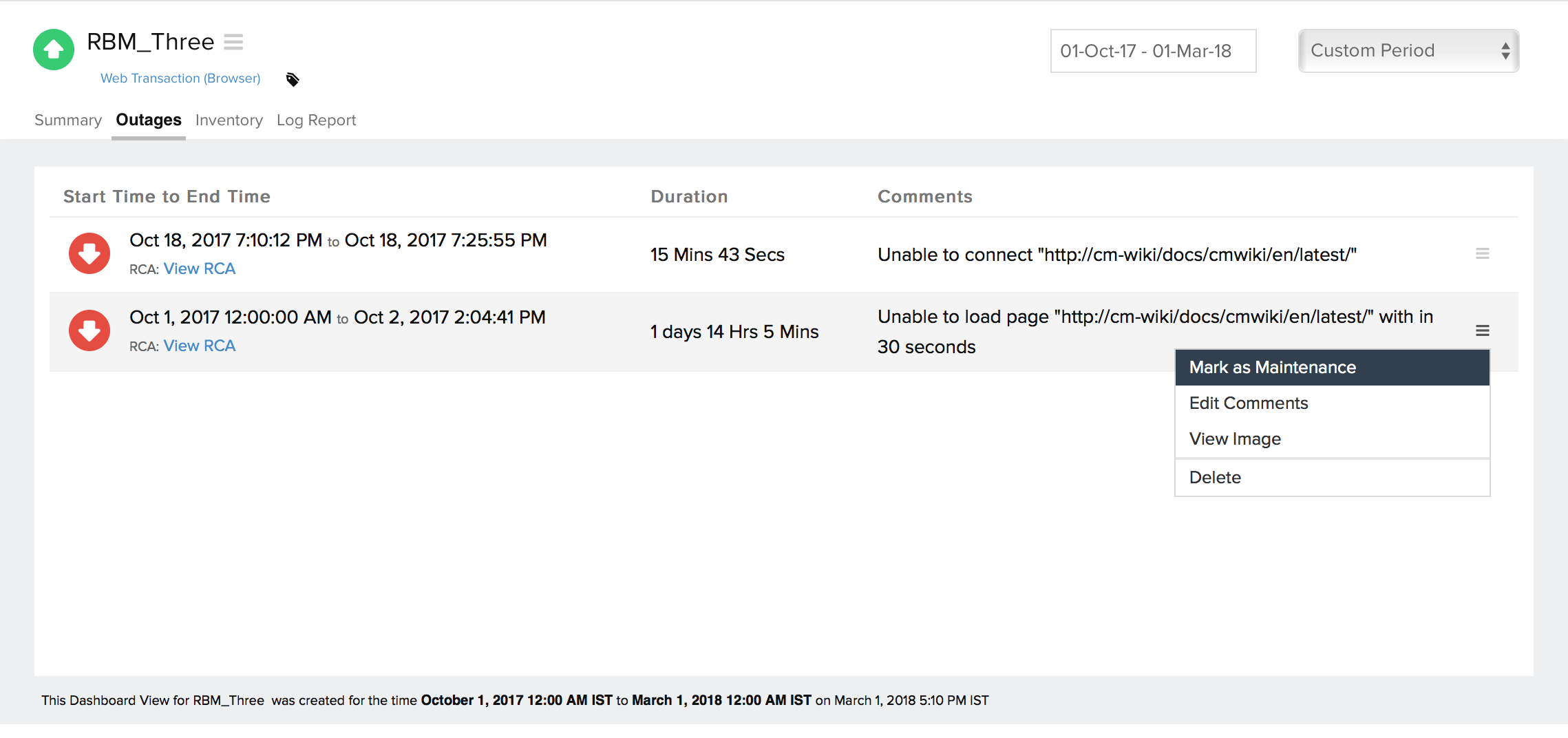You can access the Outages tab in your monitor's details page to gather detailed insights on the various outage and maintenance downtimes. It provides you with sufficient information to troubleshoot issues. You'll also be able to access the root cause analysis reports for your various outages. On accessing the