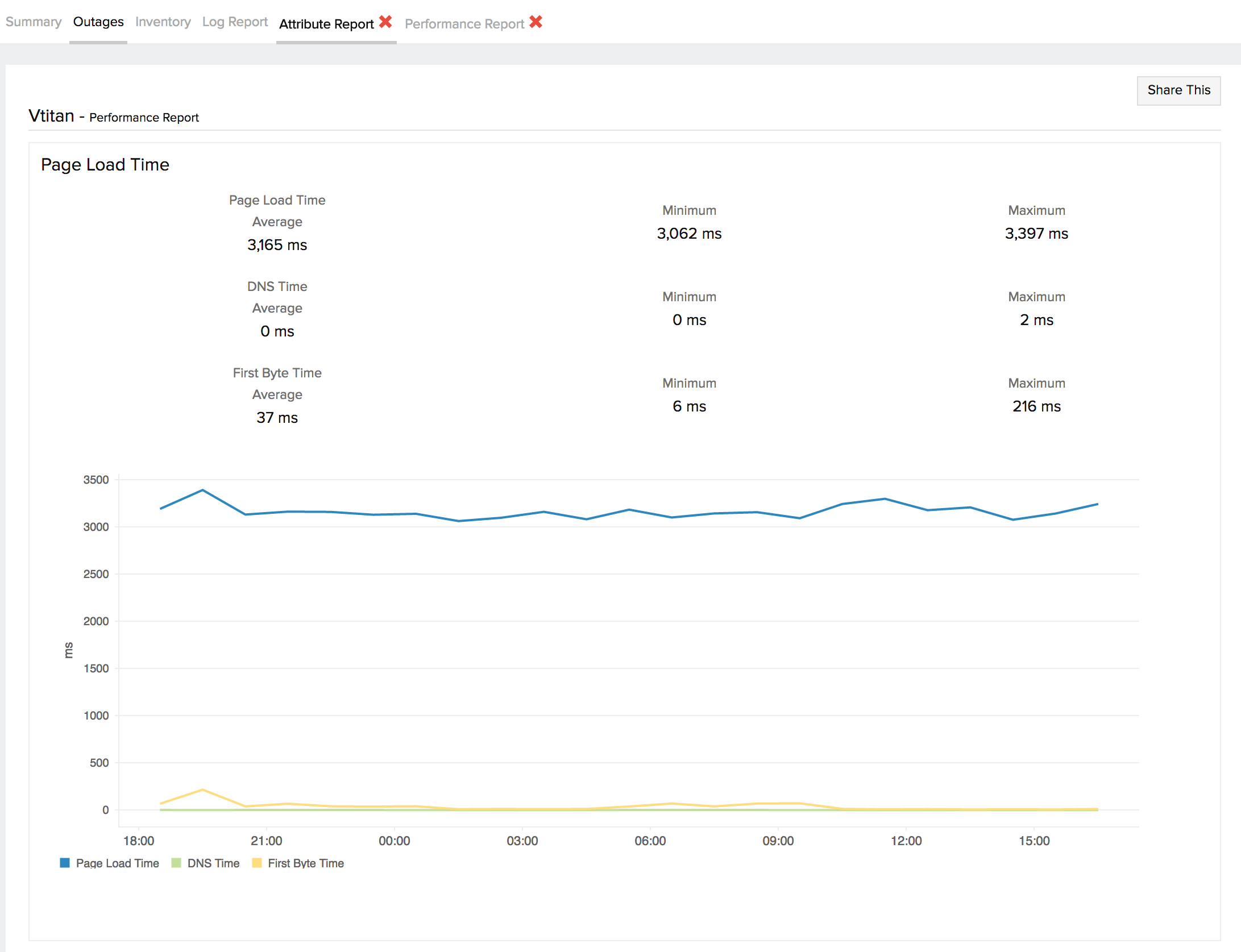 - Availability & Page Load Time by Location (ms): It offers a graphical and tabular interpretation of the availability and average location wise page load time data in milliseconds.